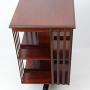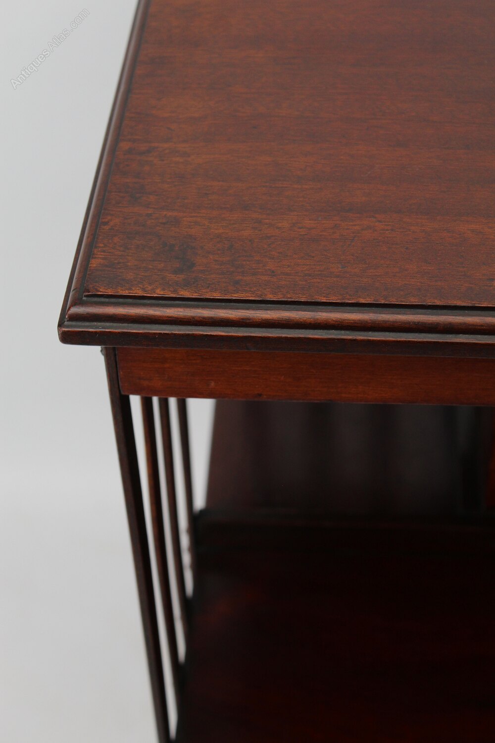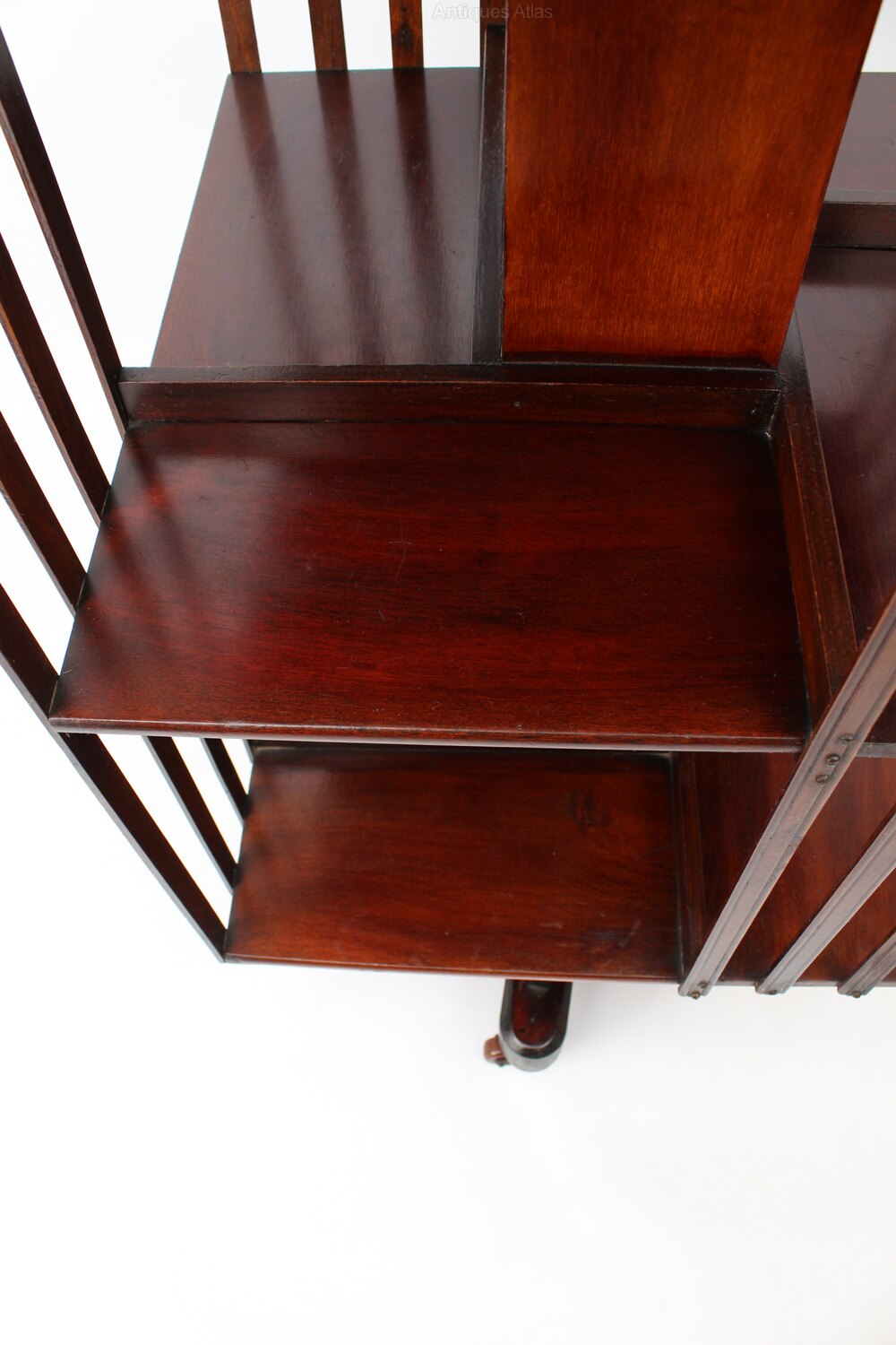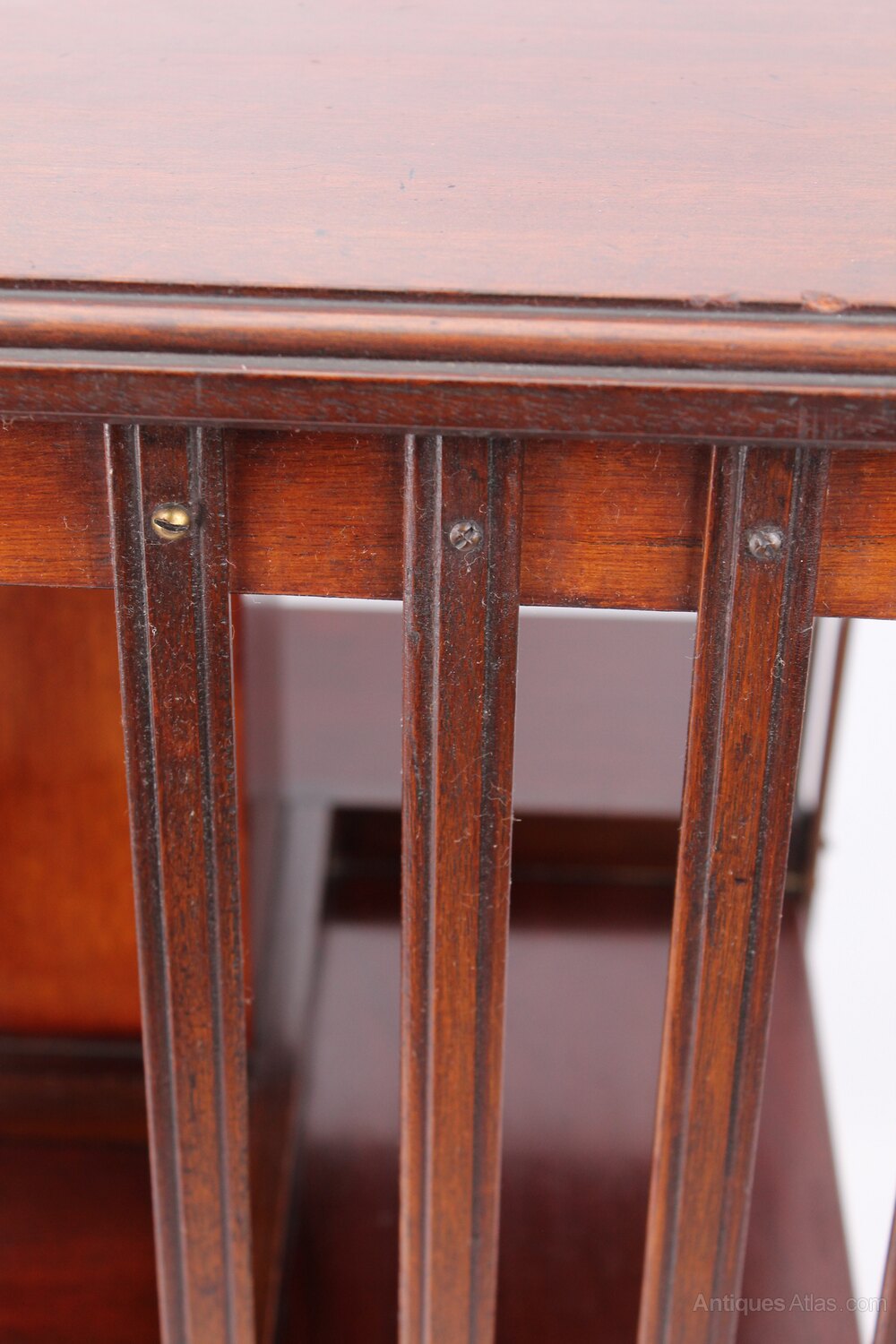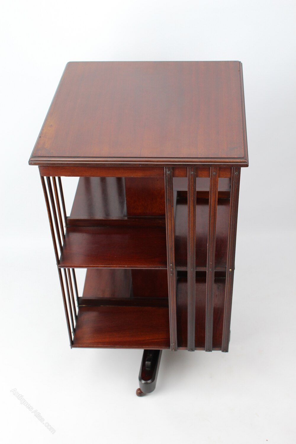 A charming antique Edwardian revolving mahogany bookcase dating from circa 1905. With two tiers each with four sections for books, with rail trims to each side. Featuring a plain recessed top, with good original colour and patina to the mahogany, the bookcase revolves on a cross frame base with ceramic casters. Attractive and functional, great for holding books or as display for a shop.