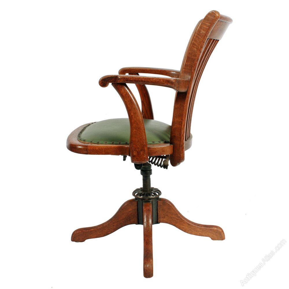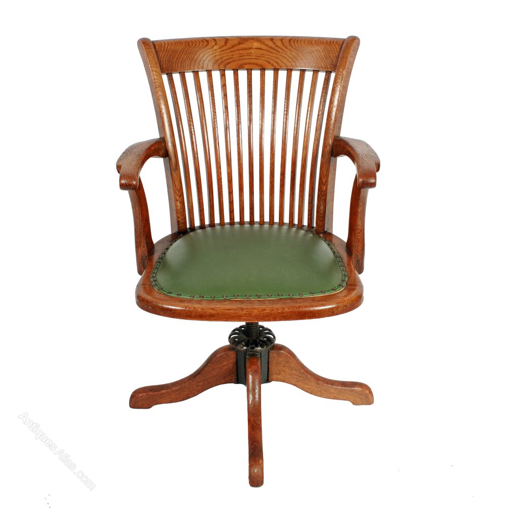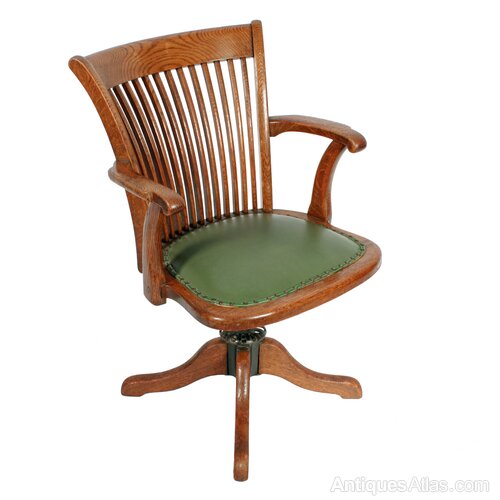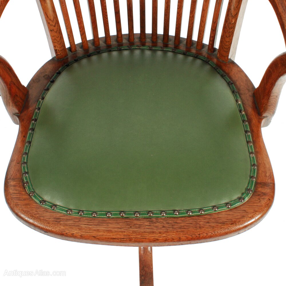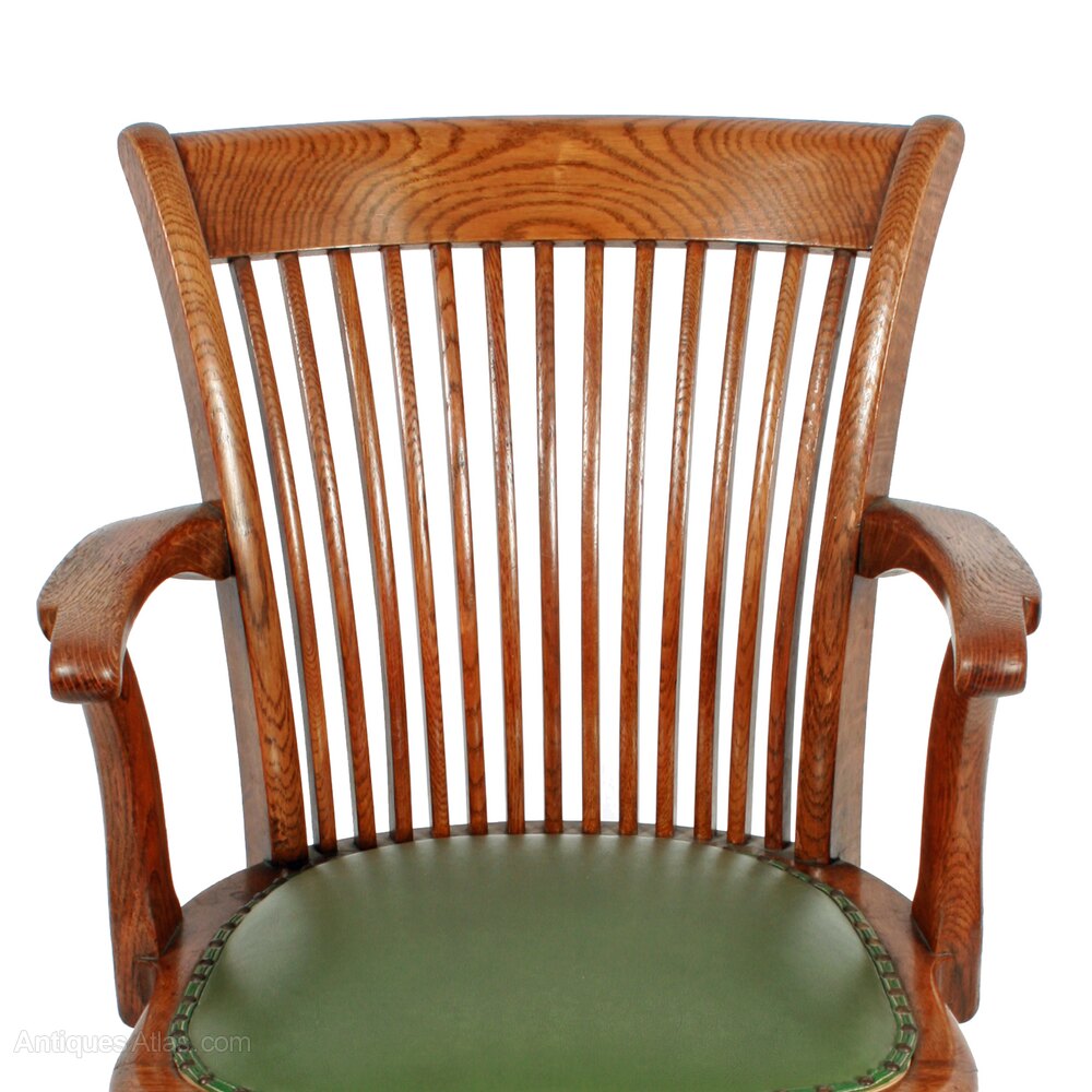 The chair has a 13 convex bar back, a concave top rail, a padded seat and shaped arm rests.