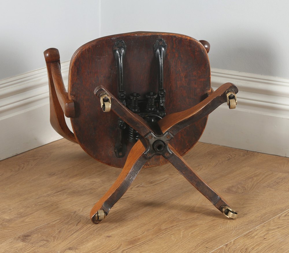The chair and mechanism are in good working original condition. Nominal old use marks to the leading edges of the chair but nothing significant considering the age of the item. The chair mechanism is in good working order, having just been cleaned and serviced. There is some play to the mechanism but this is perfectly acceptable, and in line with the age of the chair. The chair features a rich golden brown colour, having been cleaned and polished in our workshops. The chair features replacement solid brass castors, which are also in good condition. This item is solid in joint and ready to use.
