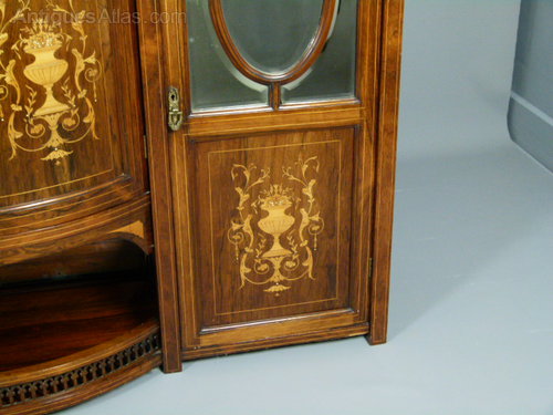 Profusely inlaid with stunning neo-classical designs, depicting classical urns, with floral, foliate, swag and scroll designs. The bow-front doors open to reveal a single shelved interior.