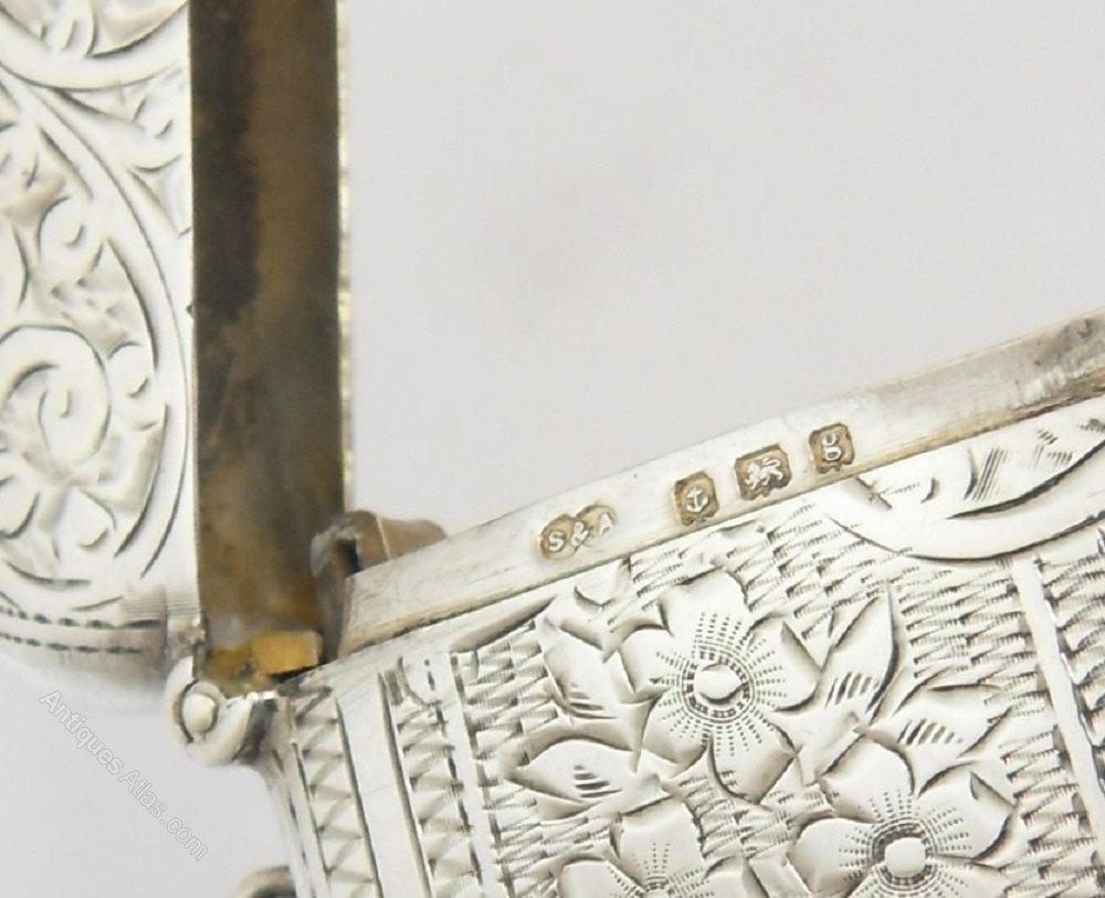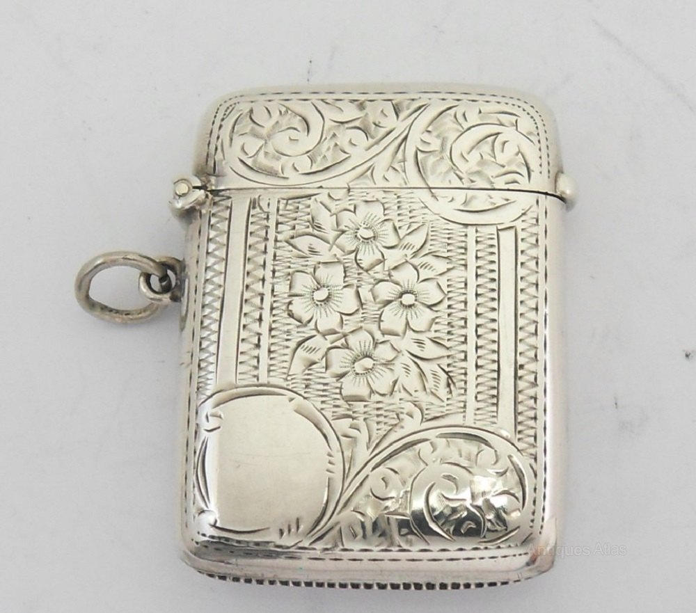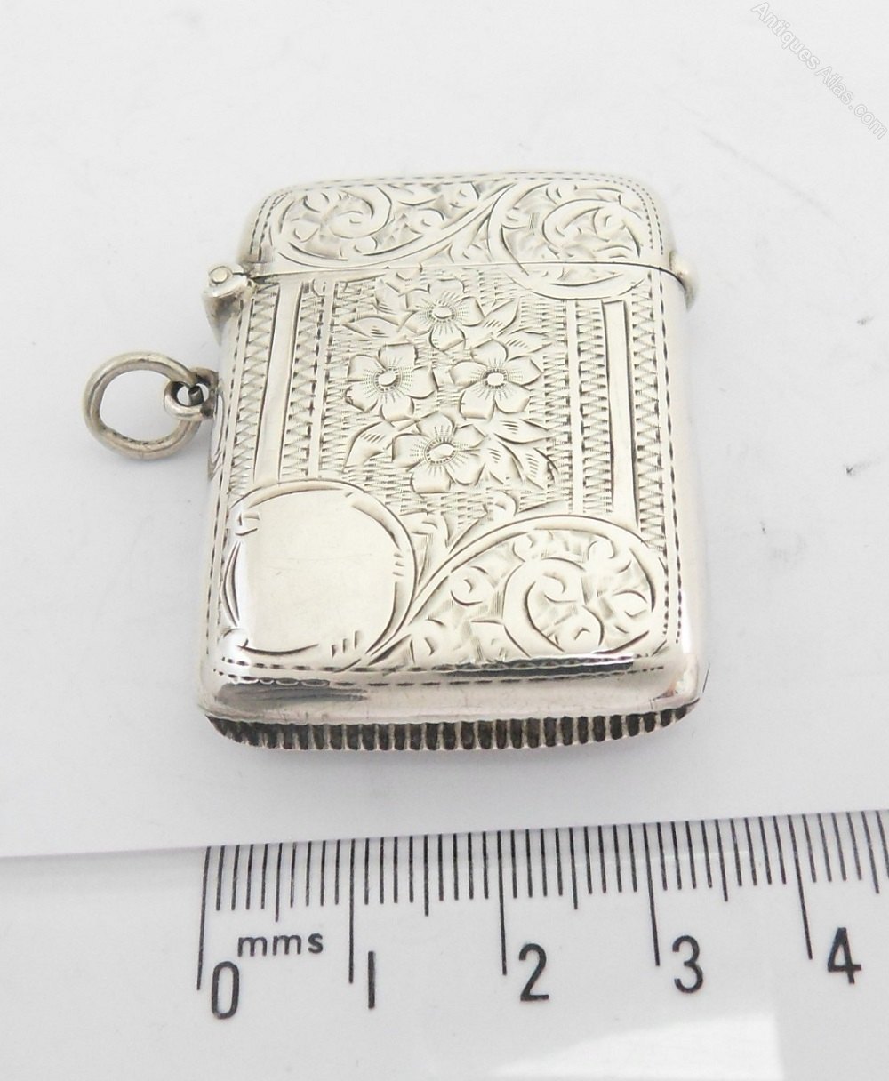 A charming solid silver vesta case, nicely engraved to the front and back with various very attractive floral patterns and neat columns. In one corner of the front is an empty cartouch (see images). Hinged on one side the lid opens and closes perfectly and there is a good fastening loop on one side. The case has clear hallmarks visible on the inside lip of the Vesta for Birmingham Assay Office, with a date mark for 1906 and the Lion Passant indicating sterling silver, along with the silversmith's maker's mark: S&A
