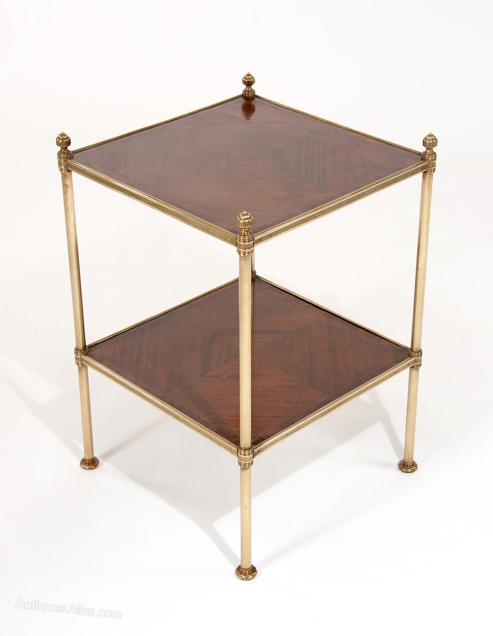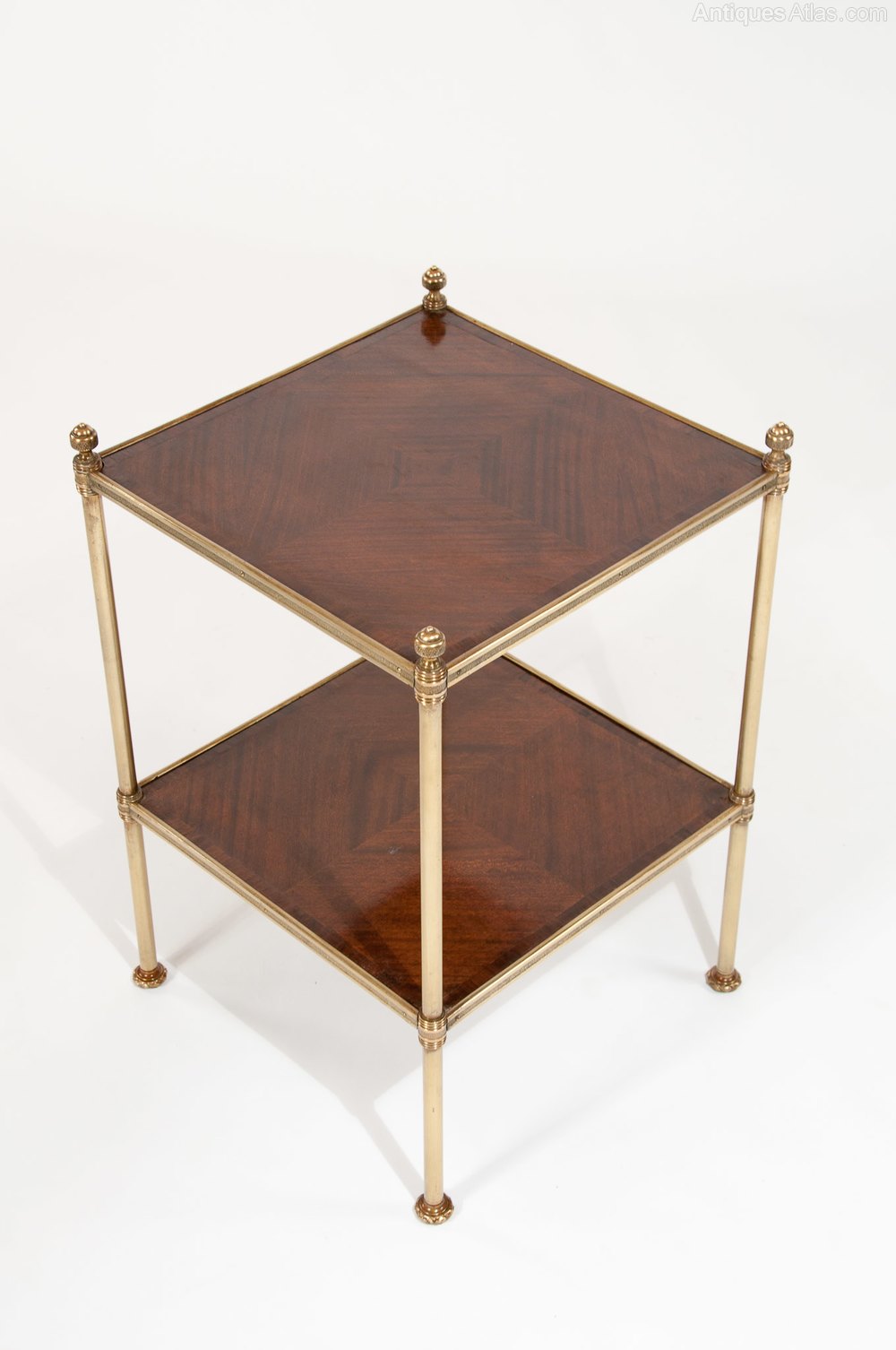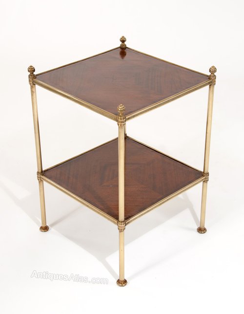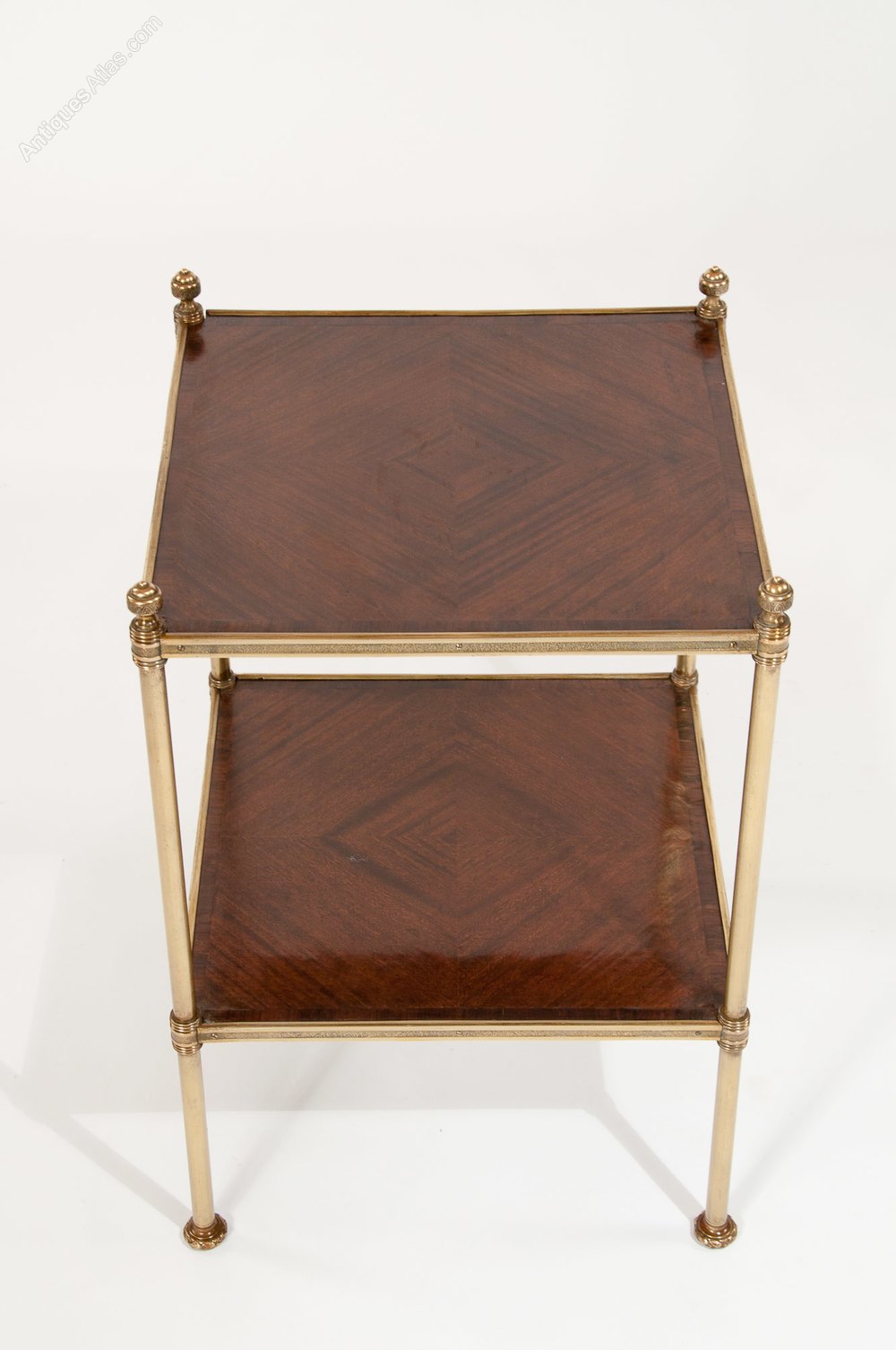 Edwardian Two Tier Brass And Kingwood Etagere. This very attractive brass etagere having a quarter vennered bookmatched top with fine crossbanded edge and matching lower tier supported by four brass turned supports with raised finials to the tops.