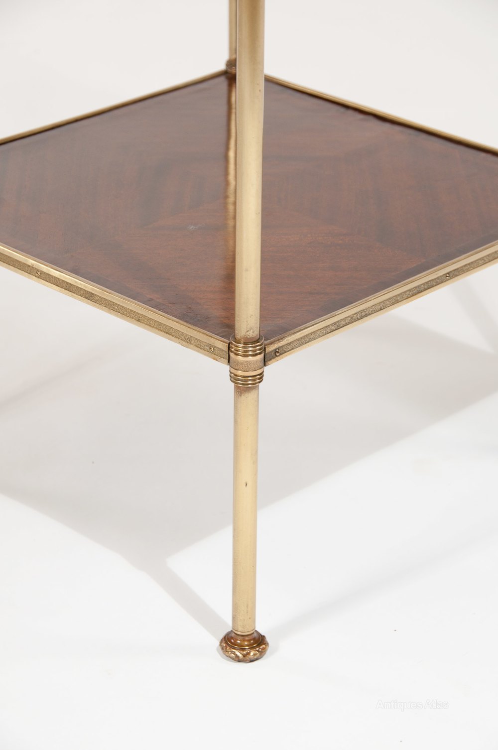 Standing on decorative brass bun feet this quality etagere is in excellent condition with striking grain and coloured timber having been hand polished using traditional methods.