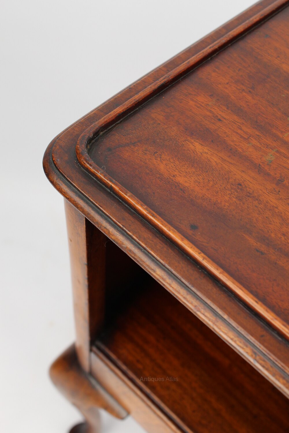 A handsome antique Edwardian walnut bedside night stand or side table by Gill & Reigate of London and dating from circa 1910. In Queen Ann Revival taste it features a tray top above and open gallery and a single drawer and stands on cabriole legs. In good condition with wonderful patina and colour to the wood it would work equally well as a bedside cabinet as it would in a hall or as a side table.