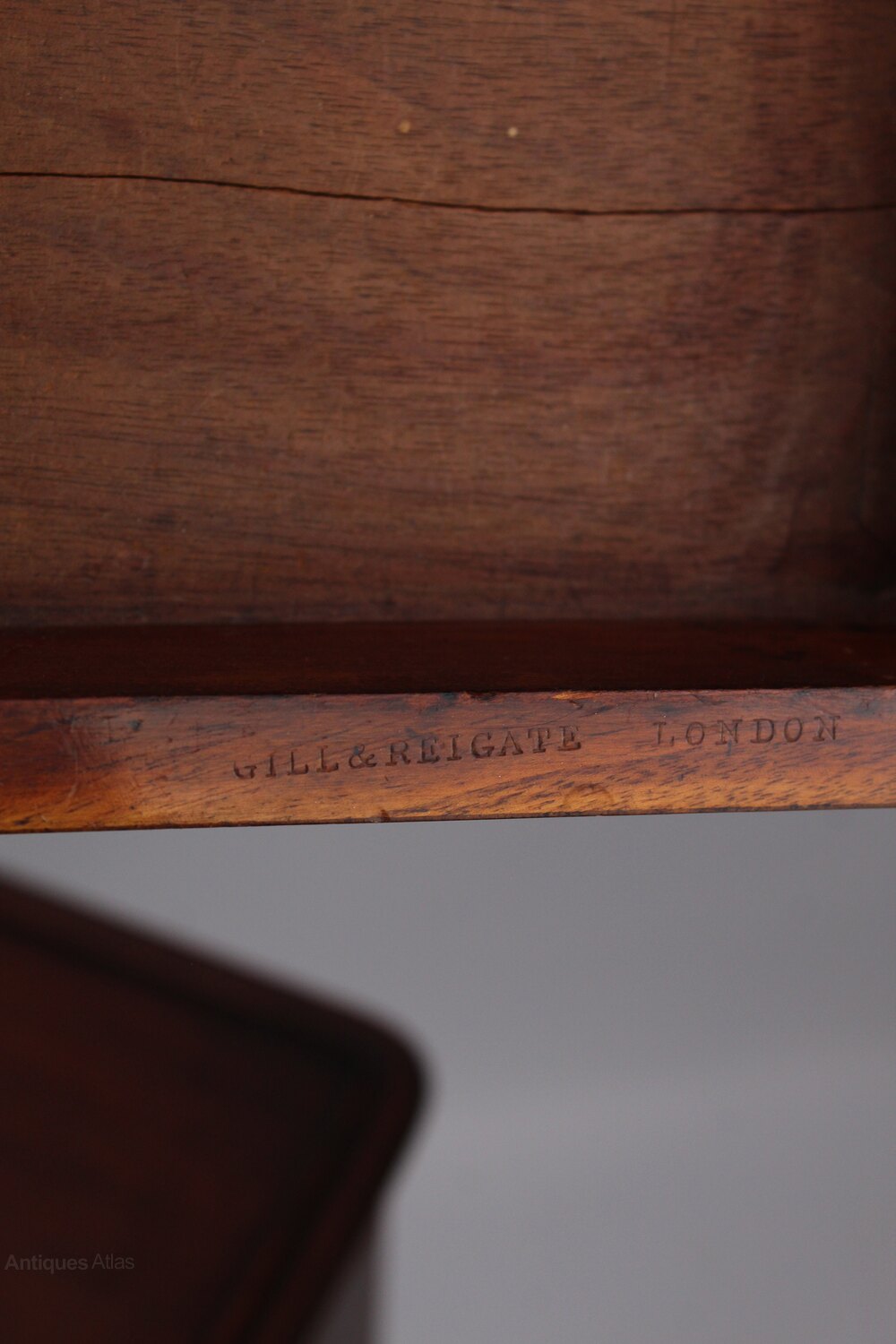 Founded in 1899 Gill & Reigate were antique dealers, furniture retailers and makers. By 1901 they were trading at 85 Oxford Street London and were described as ‘Dealers in Antique & Modern Furniture, Artistic Decorators and Upholsterers’. The firm were decorators to King George V as well as designing and furnishing the Royal Apartments at the Wembley Stadium for the Empire Exhibition in 1924-25.