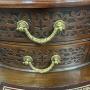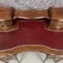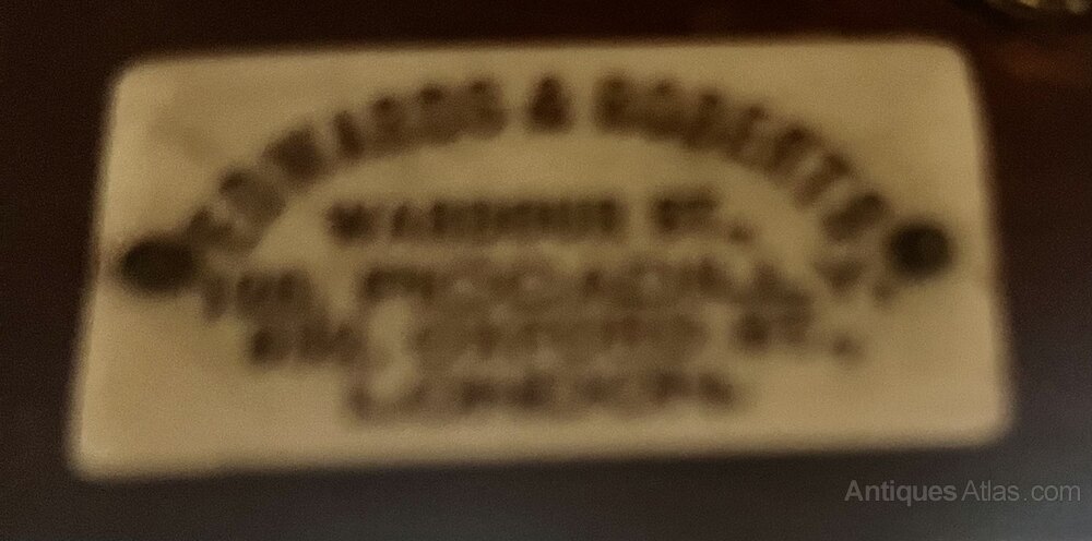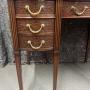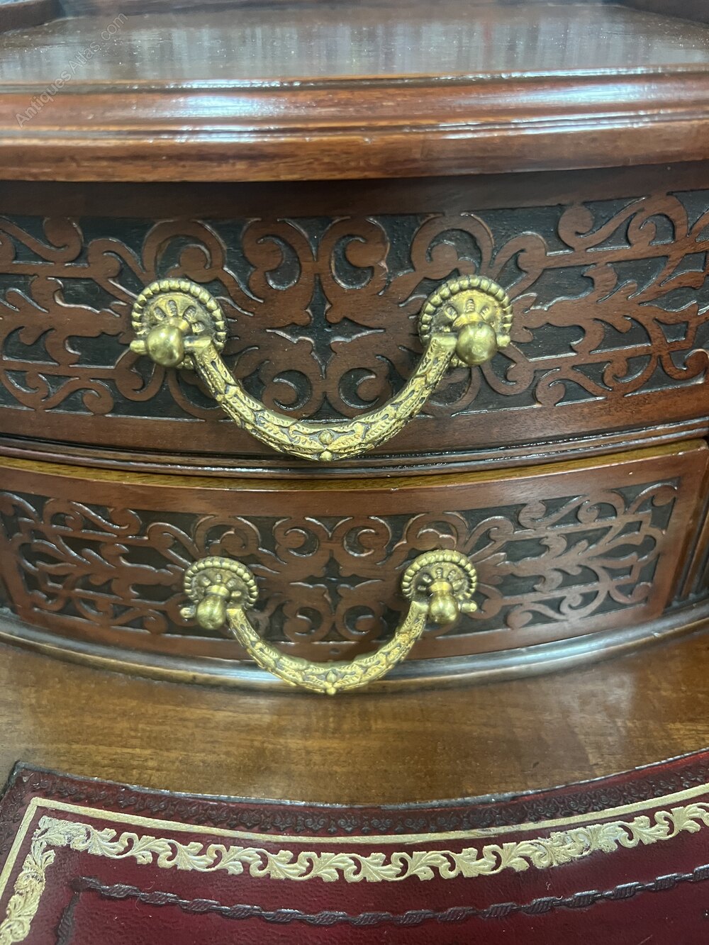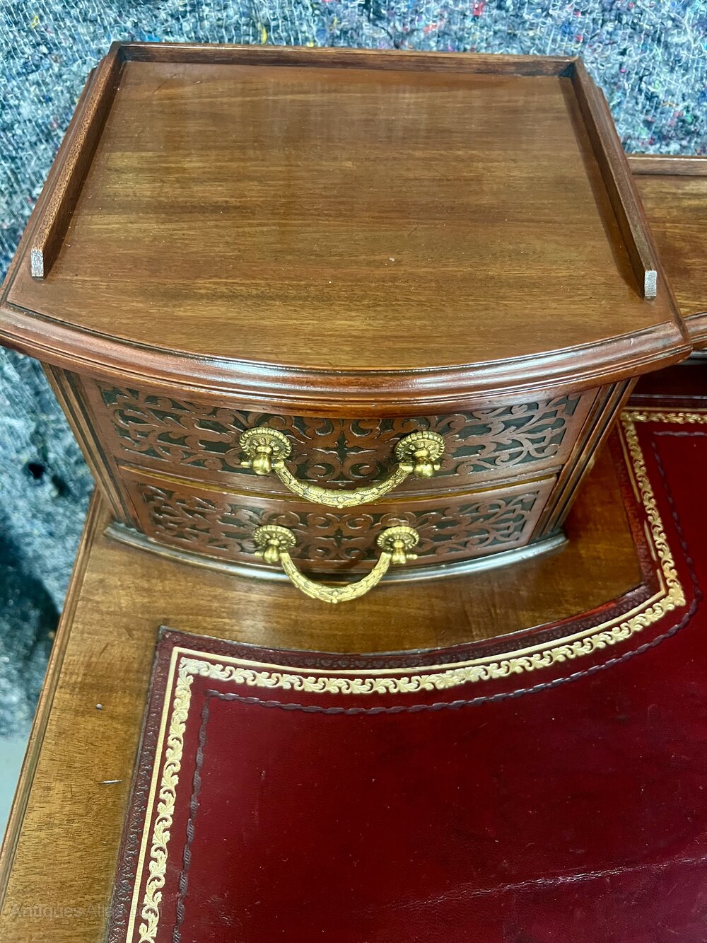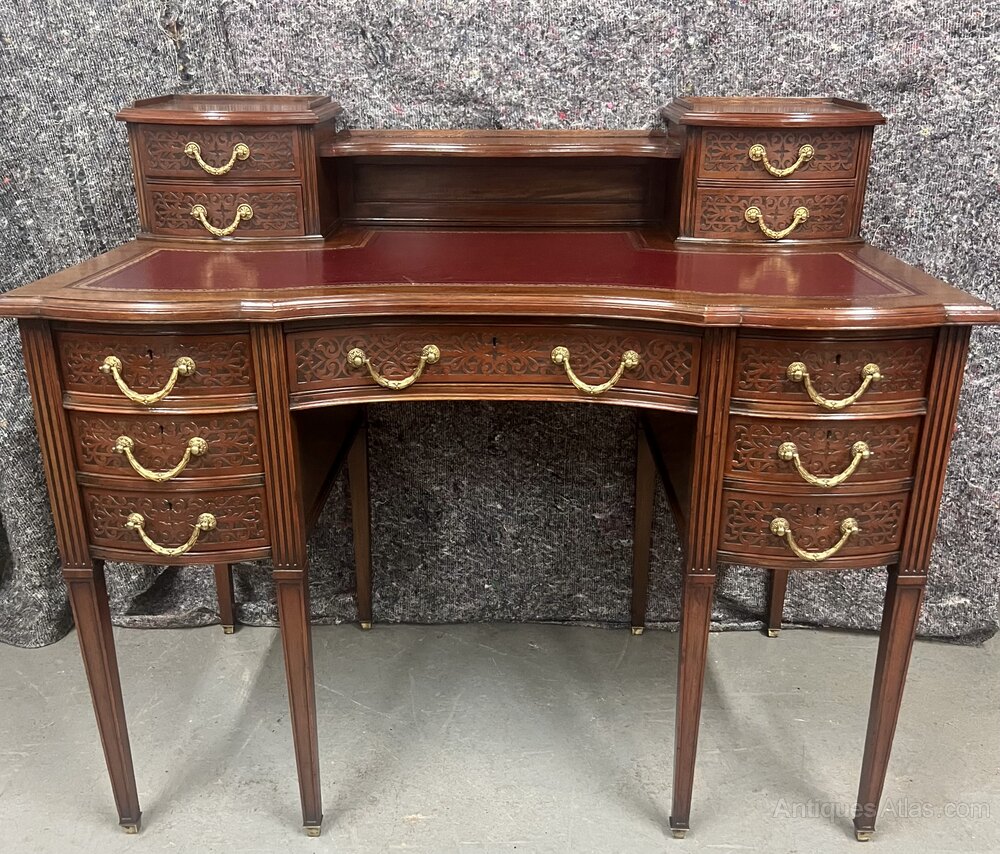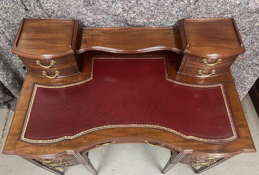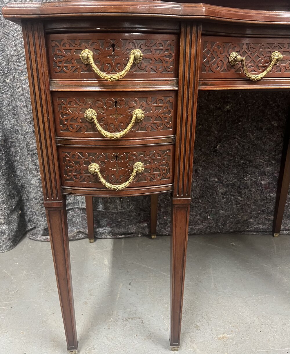 A good late 19th.Century Edwards & Roberts mahogany and blind fret decorated Carlton House Desk. The top section centred by a shaped shelf flanked by 2 banks of 2 bow fronted drawers with shallow galleries and fretted fronts. The writing surface with a hand dyed burgundy leather which has blind and gold tooling set within the mahogany border. The serpentine shaped front having a concave drawer flanked by 2 banks of 3 bow fronted and graduated drawers all having conforming fret work and the whole raised on 8 square tapering and fluted legs terminating in brass square caps. Condition- Very good, with original top quality gilded brass handles, working locks with keys and mahogany lined throughout. Dimensions:- Height…36’’/ 91.5cm. Width…41.5’’/ 105.5cm. Depth…24’’/ 61cm. Kneehole Height…24’’/ 61cm. Delivery to most of U.K. by furniture carrier £60.
