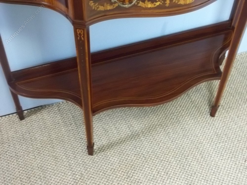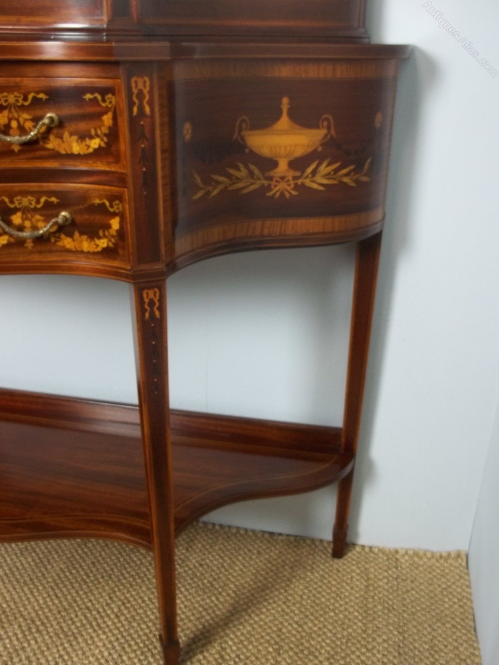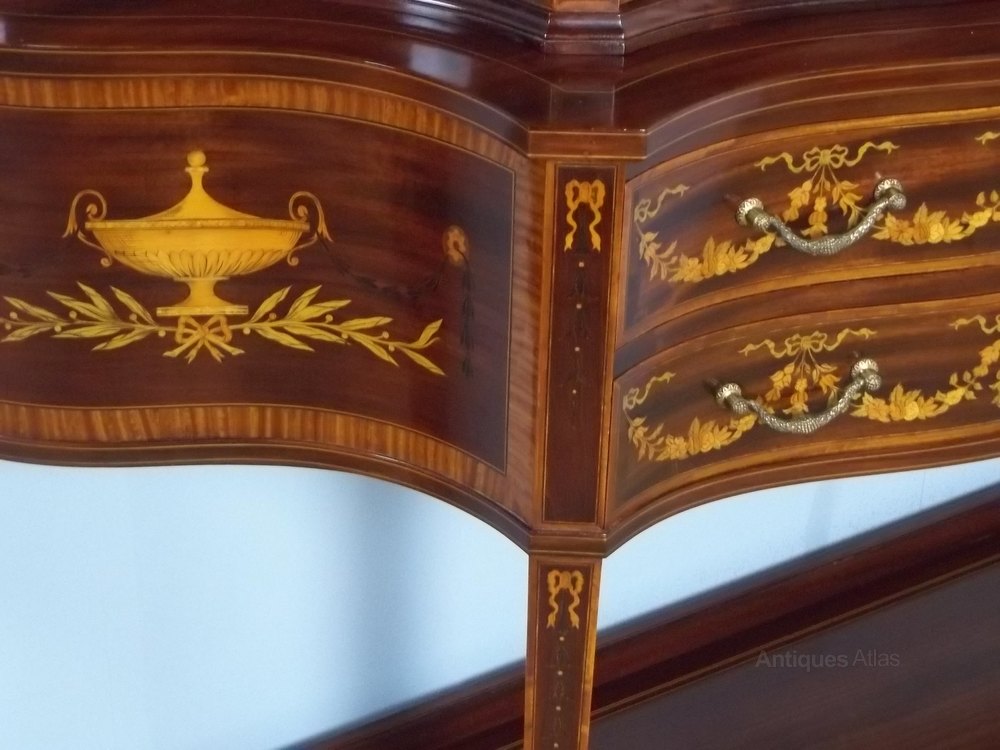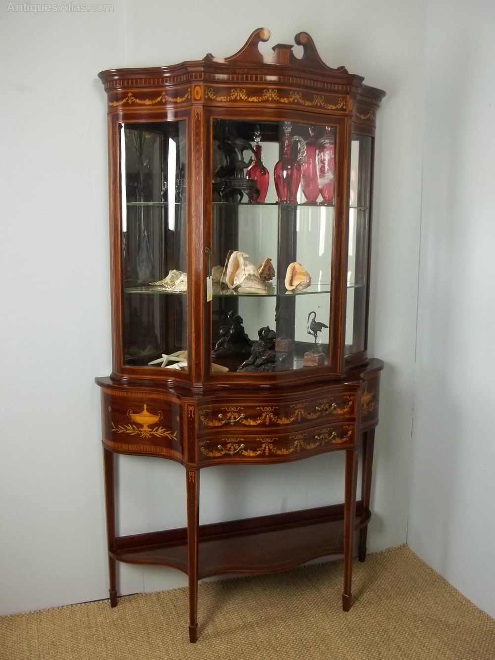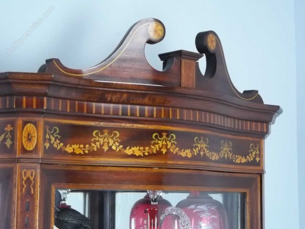 An excellent quality antique mahogany and marquetry inlaid display cabinet, firmly attributed to Edwards and Roberts. Having the more desirable serpentine form and bearing the remains of an original paper label. This antique sheraton edwardian curio collectors antique jewellery glass display cabinet comes in two sections with a swan neck pediment and mirror backed top. The base with two drawers and original gilded handles.The whole raised on tapered legs and spade feet and profusely inlaid with scrolling marquetry foliage. Circa 1895.
