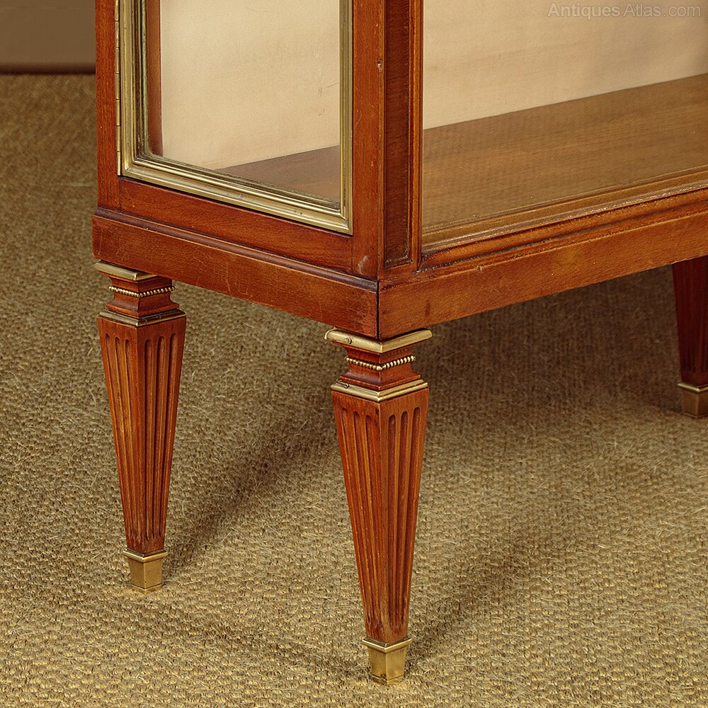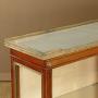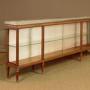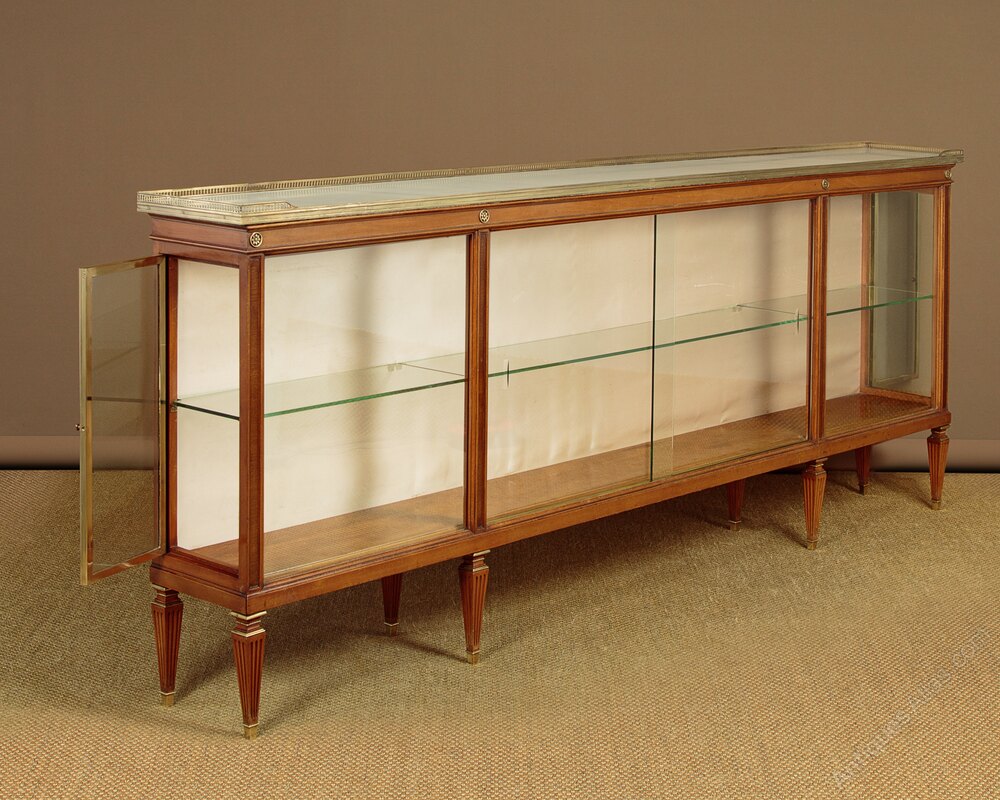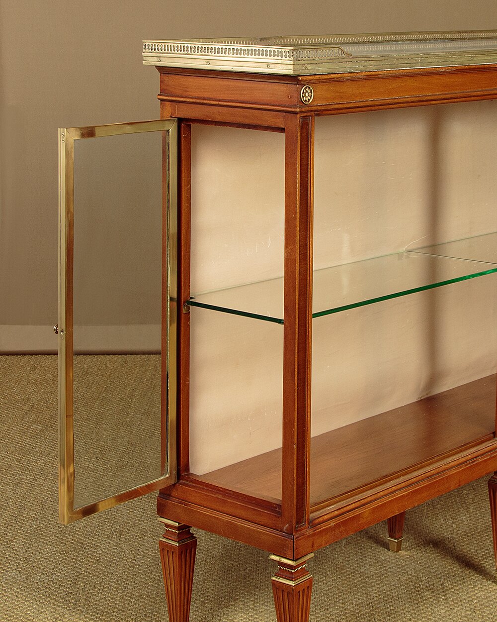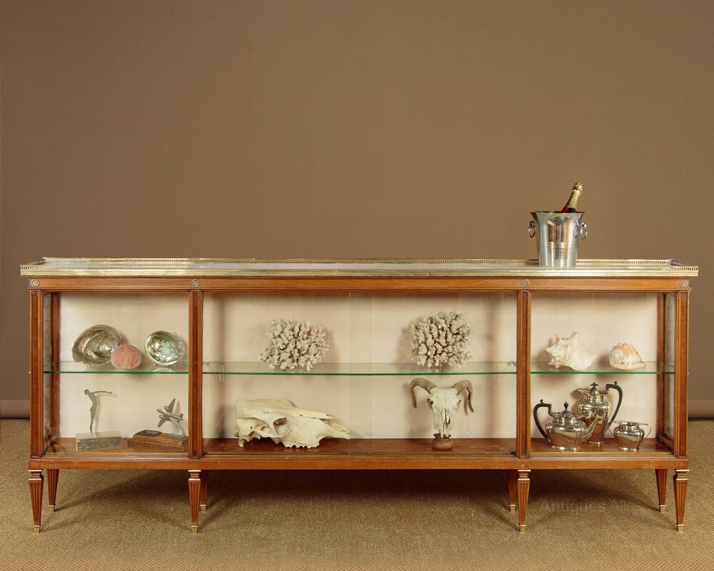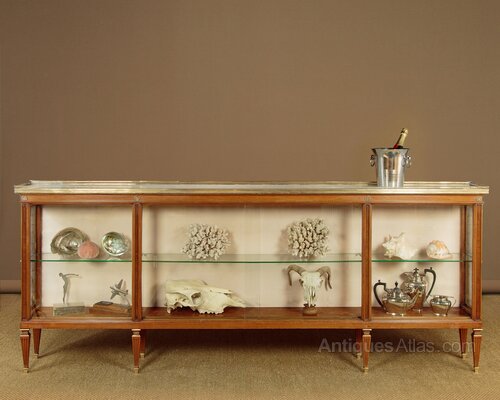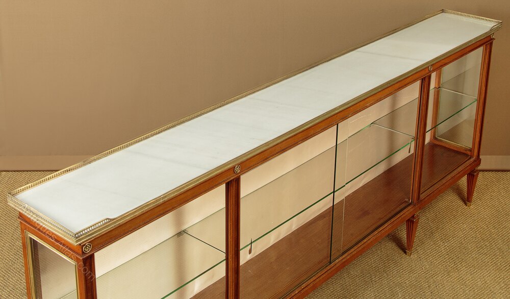 Impressively long marble top glazed display cabinet c.1950. Unusual dimensions being 95" long and just 12" deep. White marble top with a brass edge moulding and pierced gallery to the sides and rear. Cabinet glazed at the front and sides with two sliding plate glass doors at the centre and (unusually) doors at both ends. Fitted inside with a single row of plate glass shelves (depth 9"), the back lined in a padded cream satin. Moulded mahogany frame with brass flower head roundel mounts and crossbanded uprights. Note the quality brass frames and full length hinges to the end doors. Raised on eight square tapering legs with fluted detail, decorative brass mounts and brass feet. Minor damage to the gallery toward the left hand end at the rear. Otherwise very good condition, cleaned and waxed in our workshops.