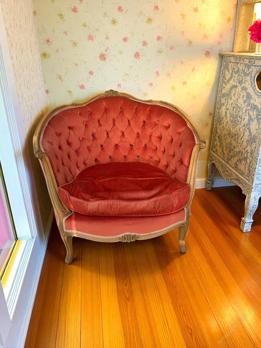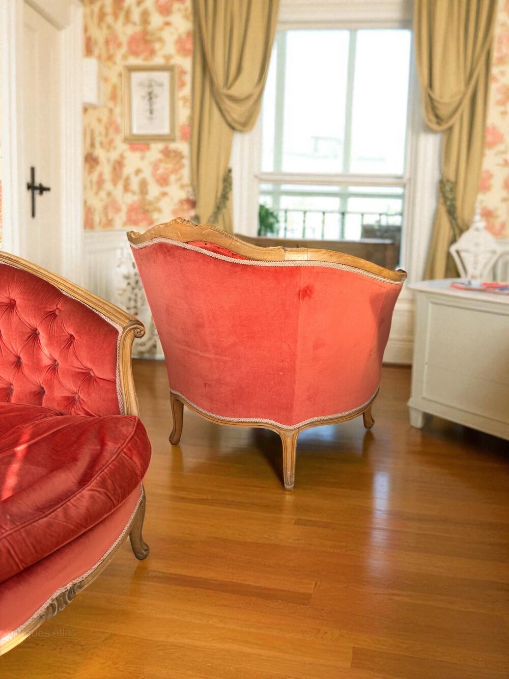Two charming French-style armchairs (fauteuils) in vintage condition. The sumptuous velvet upholstery is a warm coral/deep-pink tone that catches light beautifully. Deep tufting across the back and seat creates a tailored, luxurious look. The exposed wooden frames feature subtle carving and a soft, light finish that complements the velvet and adds a touch of period character. These chairs pair equally well with contemporary interiors or traditional decor and make a strong visual statement while remaining comfortable for everyday use.