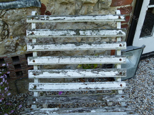 The condition is very good, the iron frame is in excellent condition, very heavy solid and sturdy. The wood is in very good condition, with the white paint being in a naturally distressed condition.
