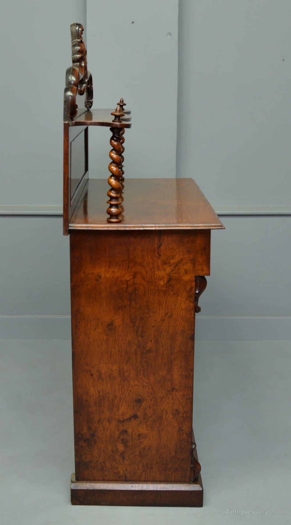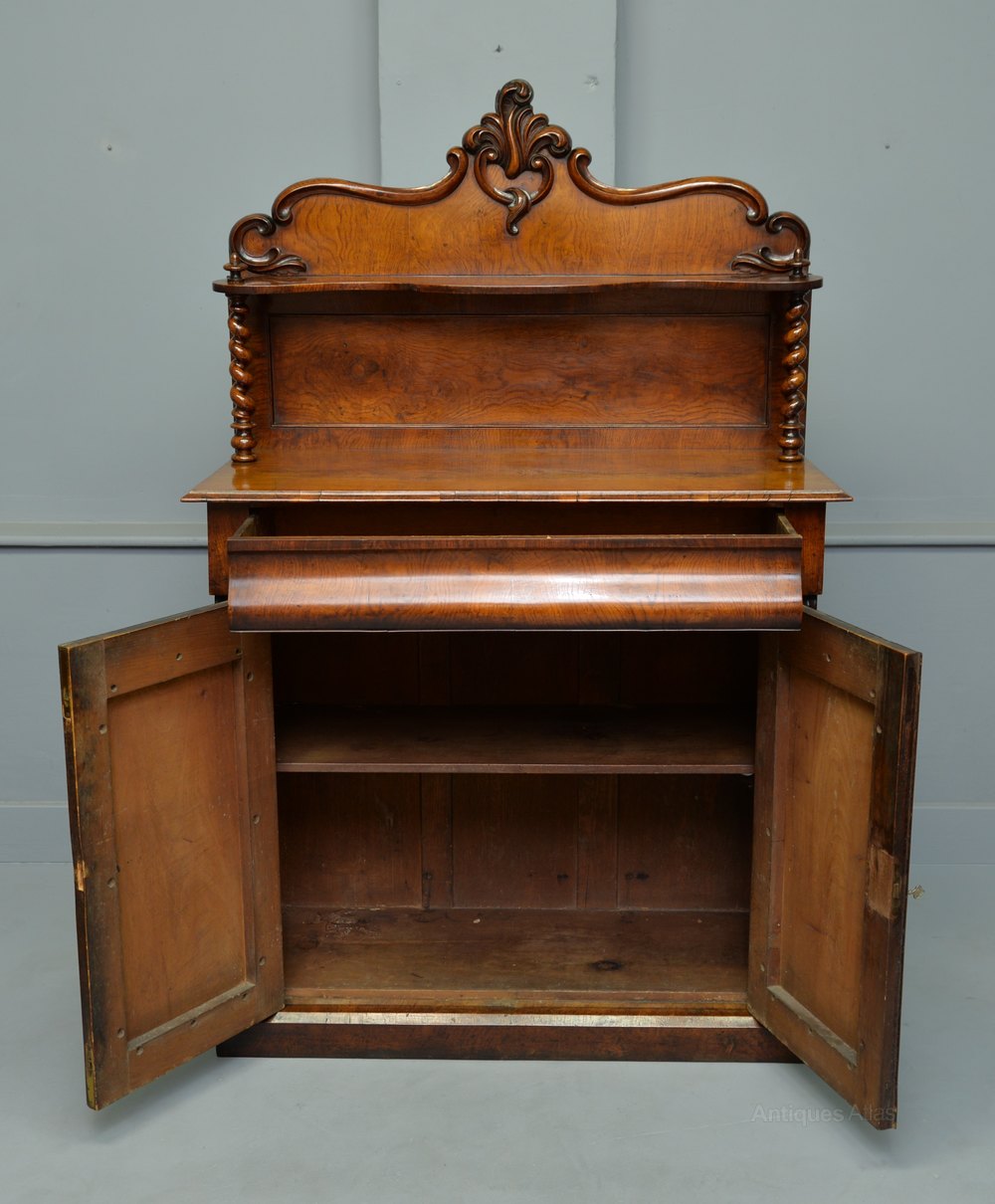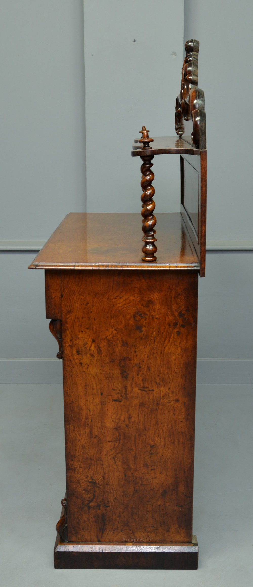 The back has a beautifully carved cresting in the rococo manner, with a serpentine shaped shelf below, having barley-twist supports. Over a cushion moulded drawer, with cabinet doors below. The doors open to reveal a single shelved interior.