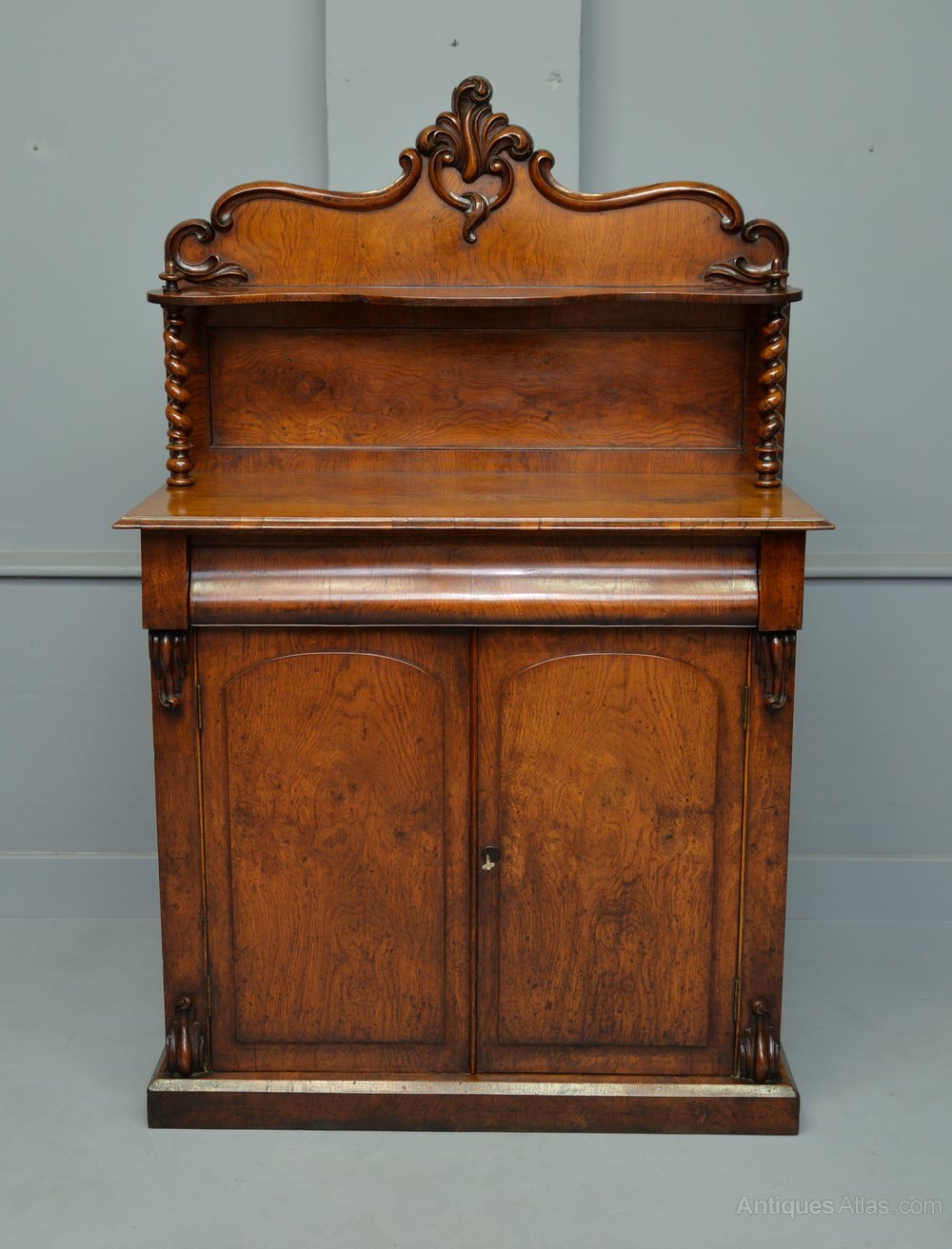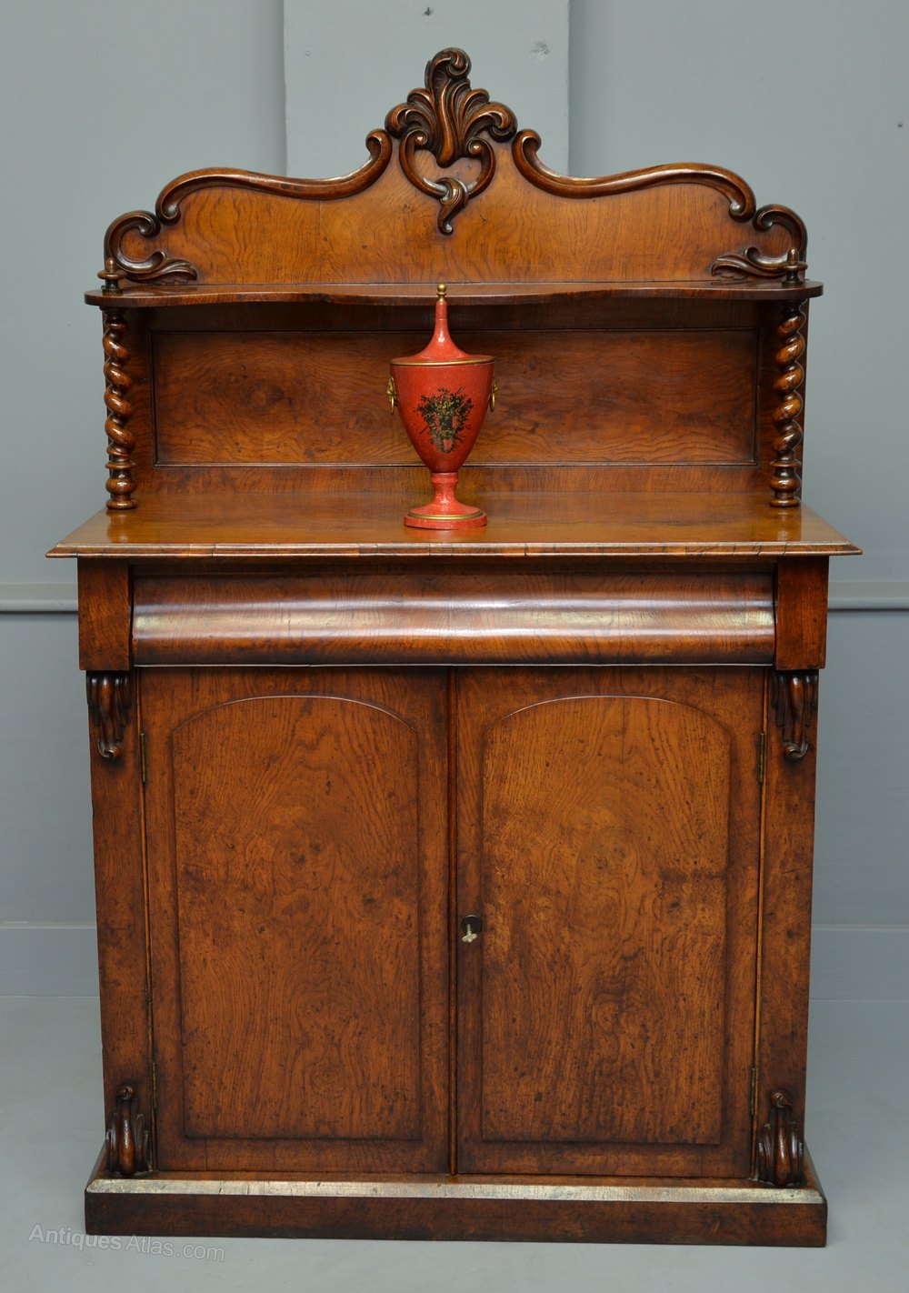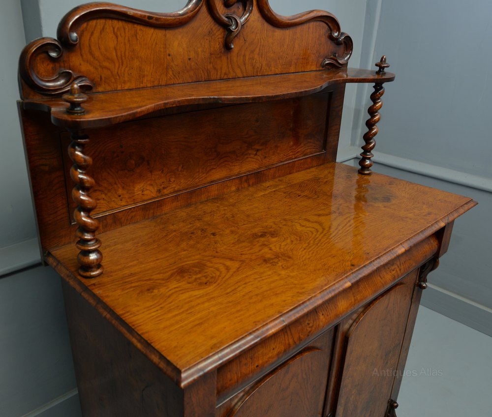 The back has a beautifully carved cresting in the rococo manner, with a serpentine shaped shelf below, having barley-twist supports. Over a cushion moulded drawer, with cabinet doors below. The doors open to reveal a single shelved interior.