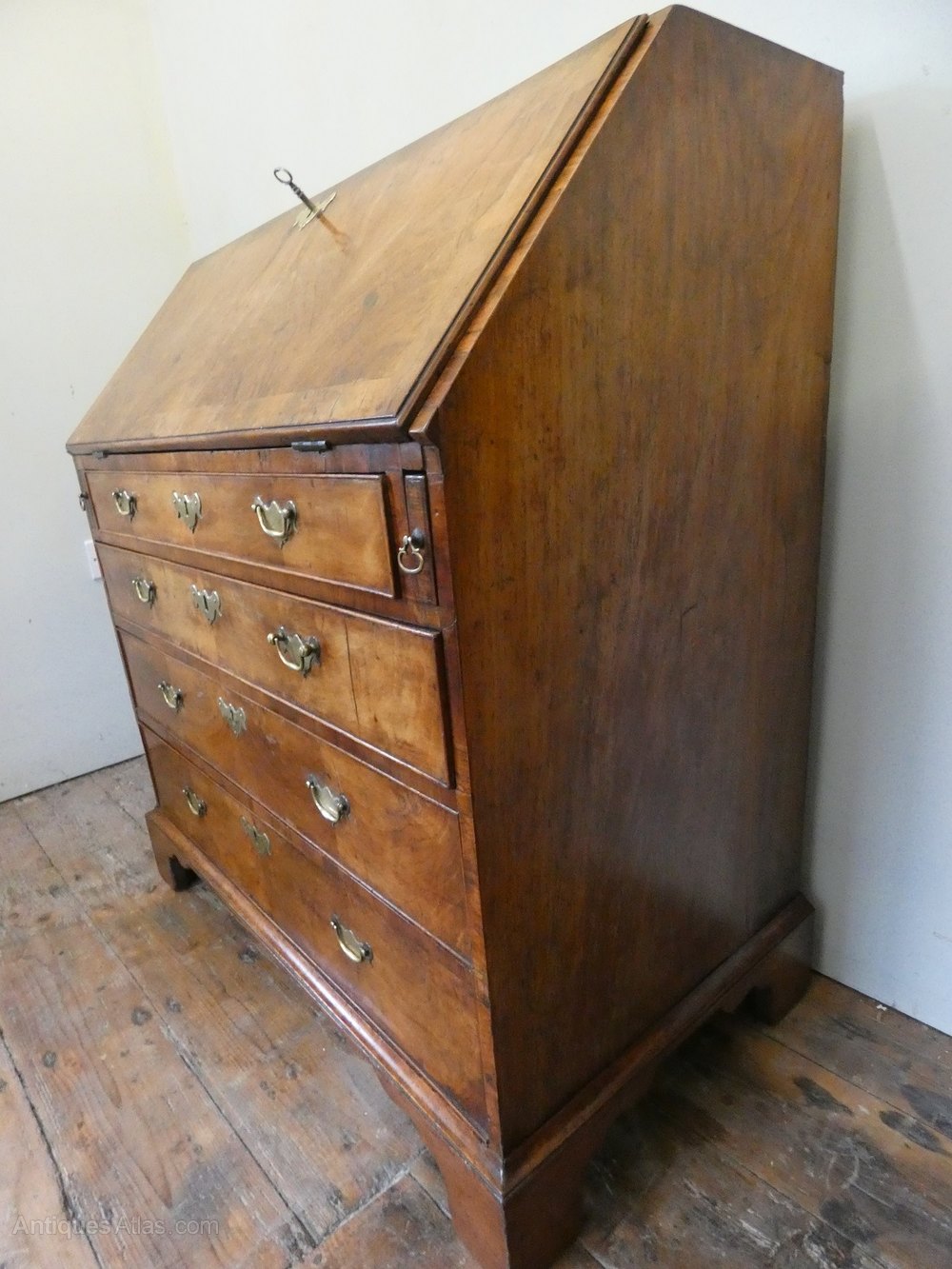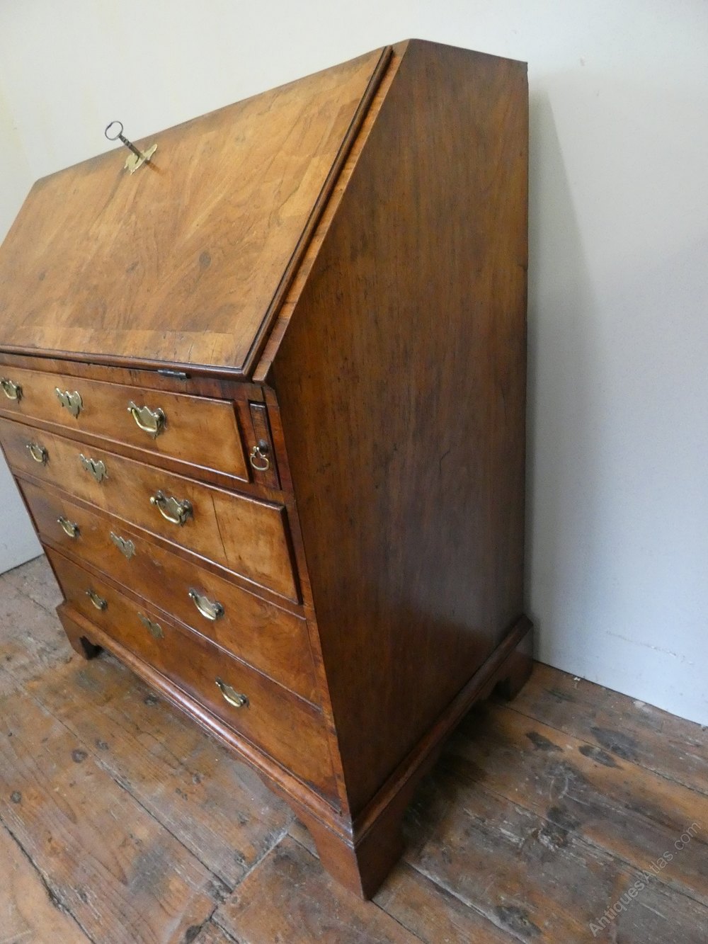 A neat sized and good quality 18th century walnut bureau, with four long graduated drawers, lined in pine, the brass handles are original. The top opening to a selection of pigeon holes and small drawers, two pull out slides to support the lid, with an old green felt, with a working key for the top.