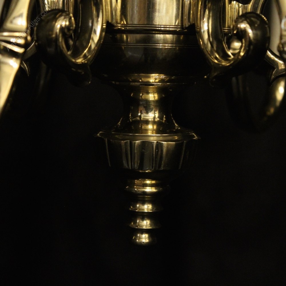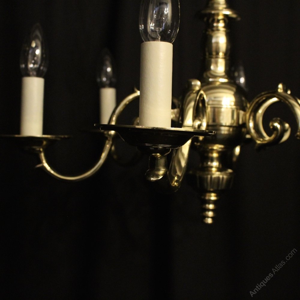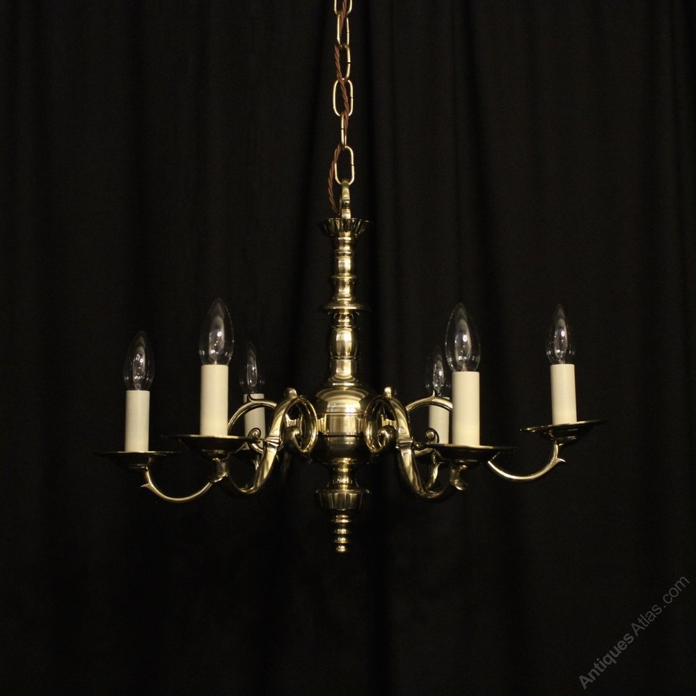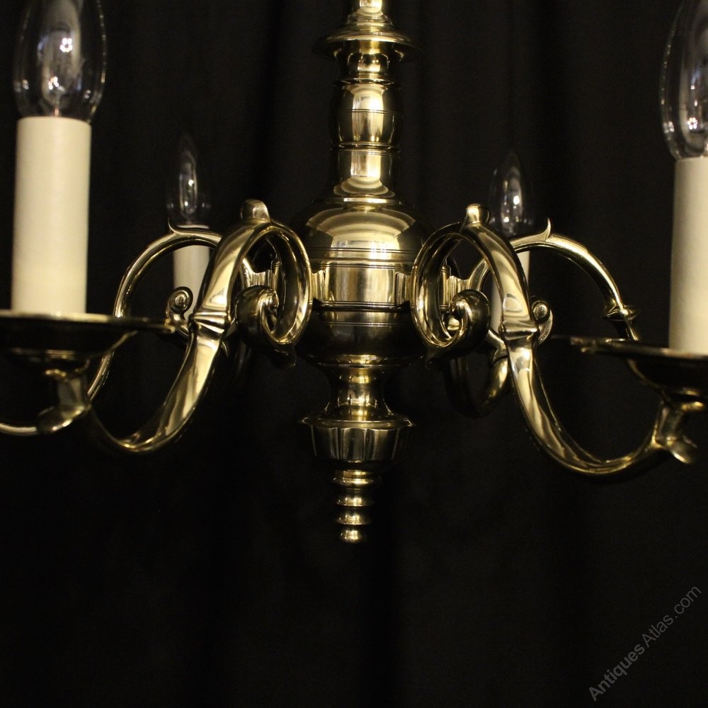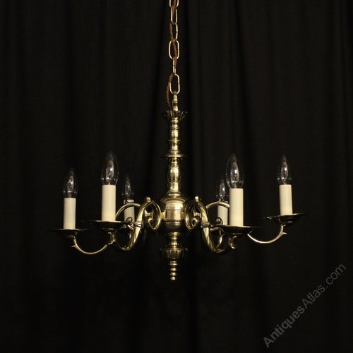 An English repolished cast brass 6 light antique chandelier, the scrolling arms with reeded bobeche drip pans, issuing from a knopped bulbous central column, sympathetically repolished and lacquered and having the original chain and ceiling rose, nicely cast and lovely clean design. Fully rewired and PAT tested. All our chandeliers come with bulbs and ceiling fixings.