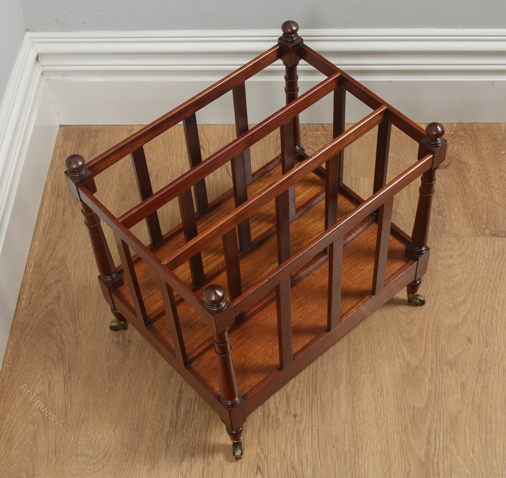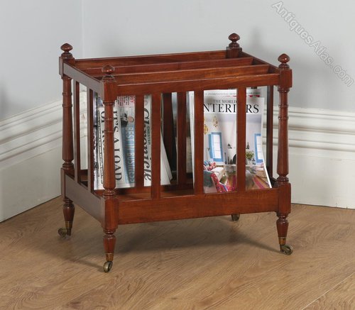 This is a fine quality antique English Regency mahogany Canterbury, circa 1830, in good original condition. The Canterbury is divided into three compartments, by four panels with simple slatted uprights. The compartments are ideal for storing magazines, newspapers or music sheets. All four corners boast ring turned supports, above four finely turned finials, which terminate on the original ring turned feet and original brass castors. The Canterbury reflects a simple but refined style, typical of the Regency period it has been constructed from the finest mahogany timbers.