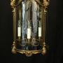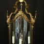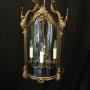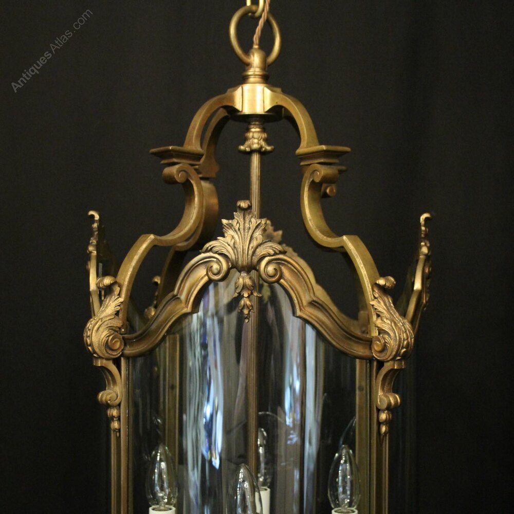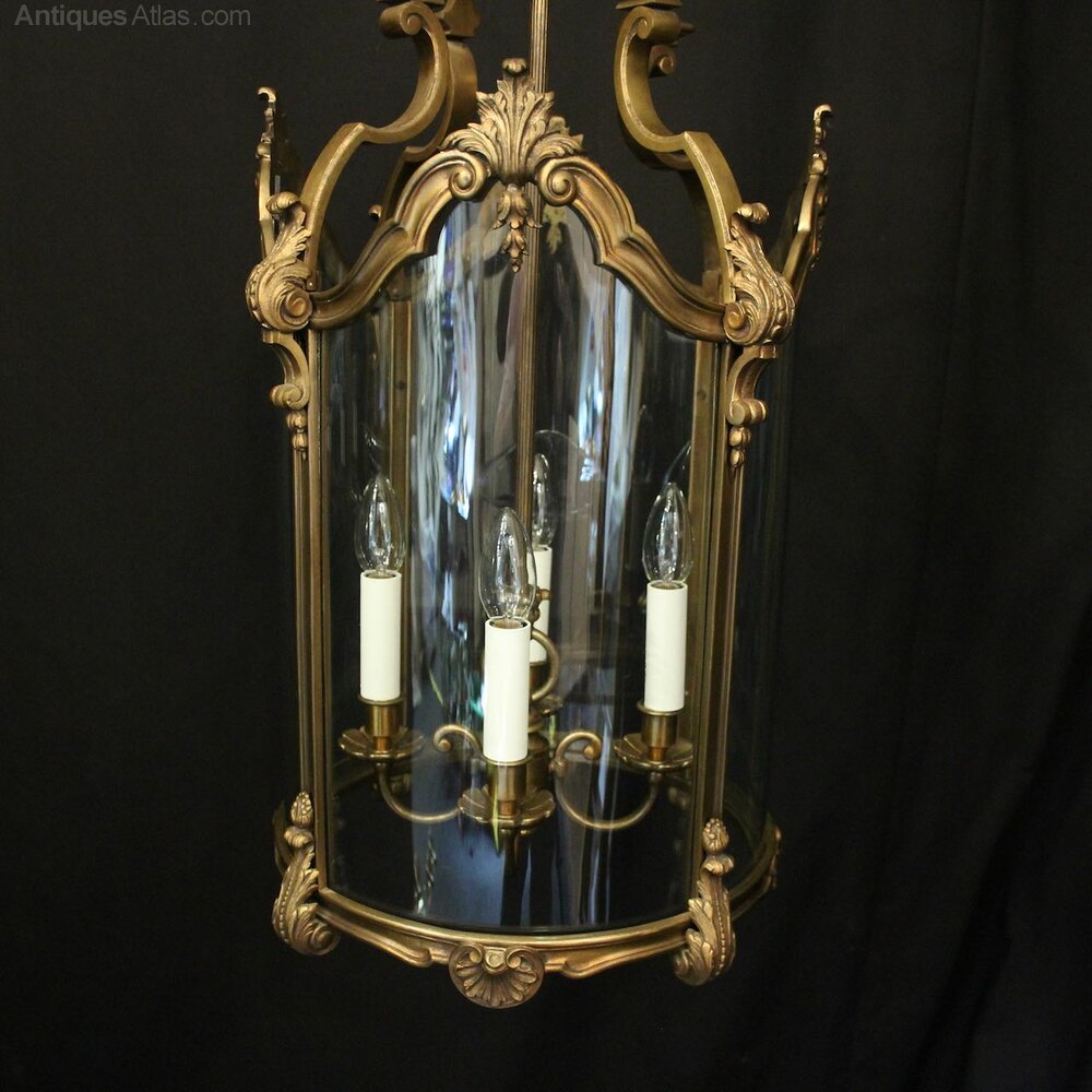 A quality English 19th Century gilded bronze four light antique hall lantern, the four scrolling light fittings with leaf bobeche drip pans and bulbous candle sconces, surrounded by four convex serpentine shaped glass panels and held within an ornate scrolling framework with leaf side panels, ornate central cartouche shields with open scrolling canopy, well cast and nice original crisp gilded patination. Fully rewired and PAT tested. All our lanterns come with bulbs and ceiling fixings. We have a matching slightly darker lantern that was in the same property in the vestibule area.