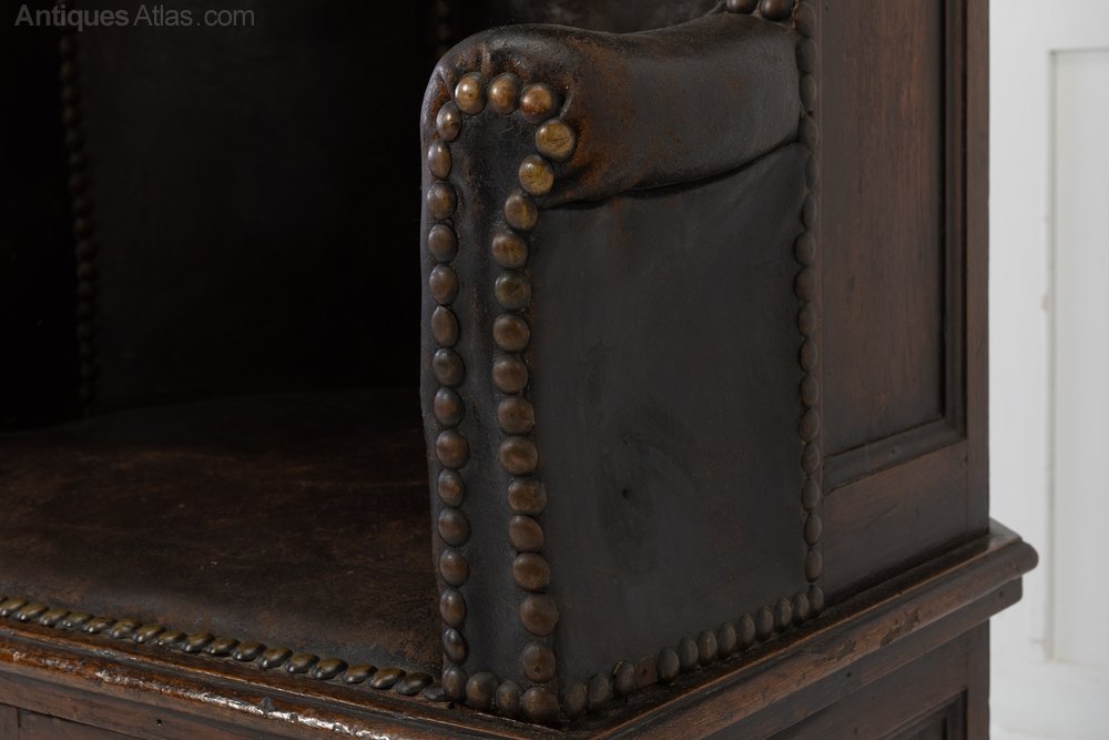 A unique English oak and leather porters chair in superb and untouched condition. The domed top has carved patterned work to the fringe with scrolls, and consists of six external oak panels. The oak frame with the domed canopy top is typical of the form but unusual in shape. The interior with leather upholstery, having bold brass studding detail and an embossed crest bearing the inscription 'nil desperandum' (never despair). The seat is also leather. Below are two panelled cupboard doors with pull handles.