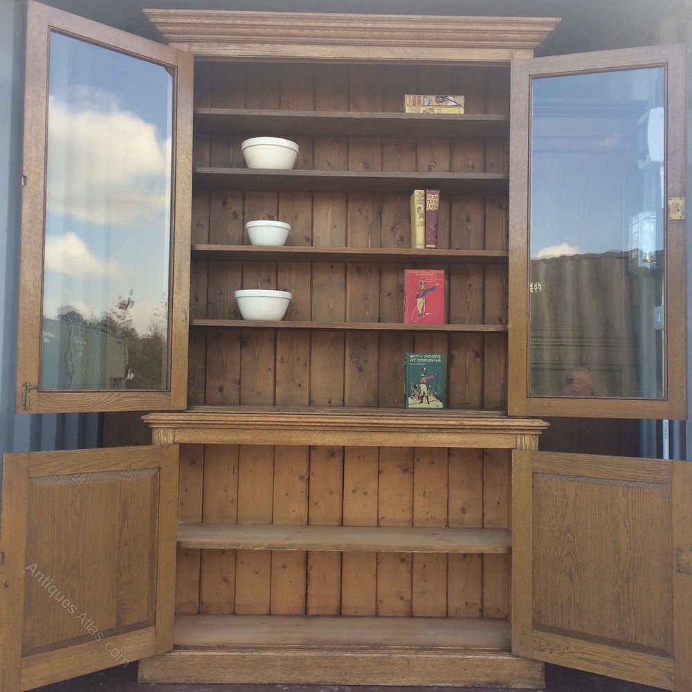 The stepped cornice over two glazed doors enclosing four pine shelves with lots of adjustment options. All raised on a cupboard base , with two figured oak panel doors enclosing a further adjustable shelf and raised on a plain plinth base. Original glazing, tongue and grove backboards , original locks and key and original brass fittings. A lovely quality piece of antique furniture which would work equally well as character kitchen storage and display or indeed in any setting! Restrained and timeless elegance!