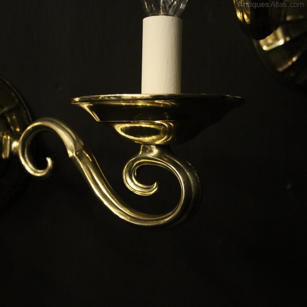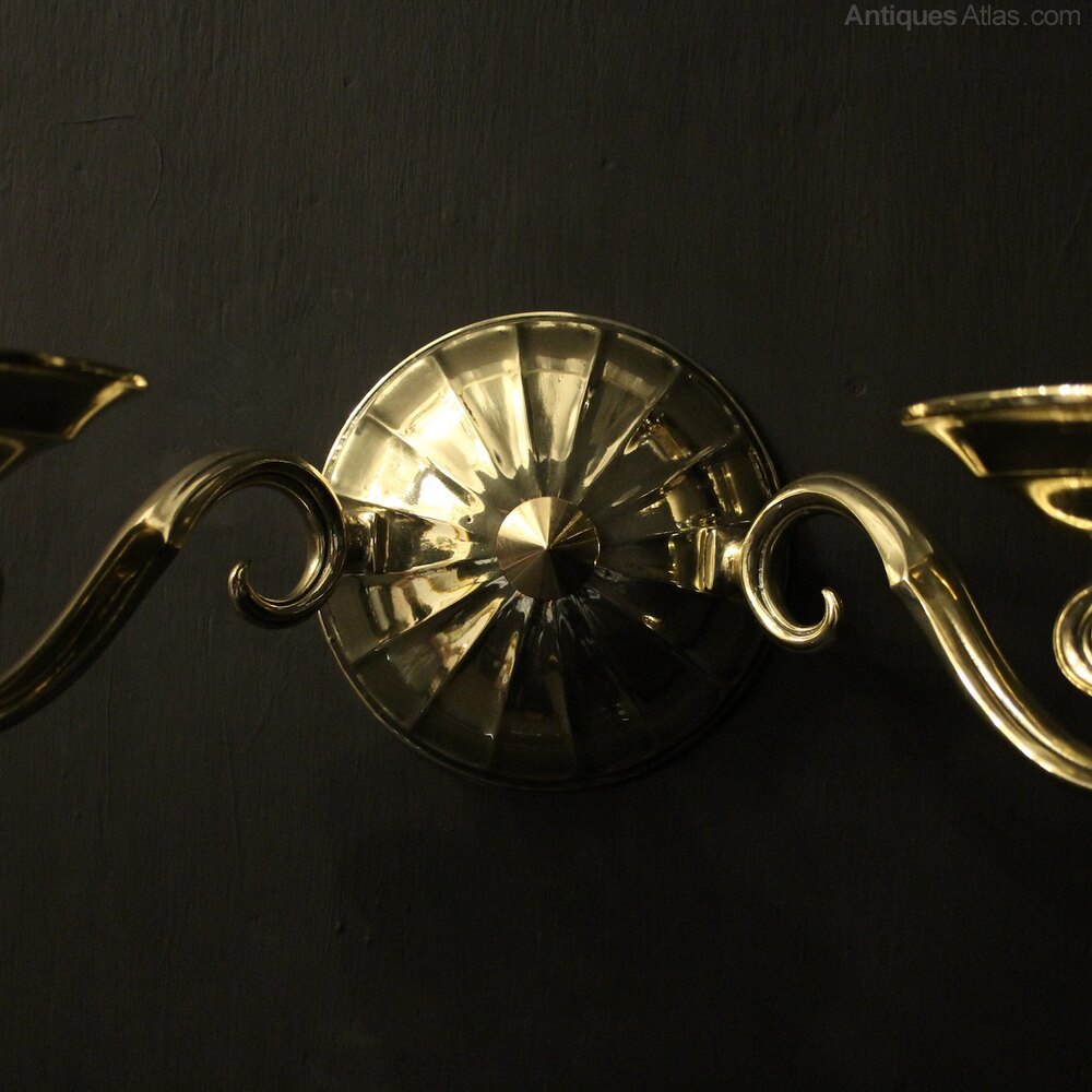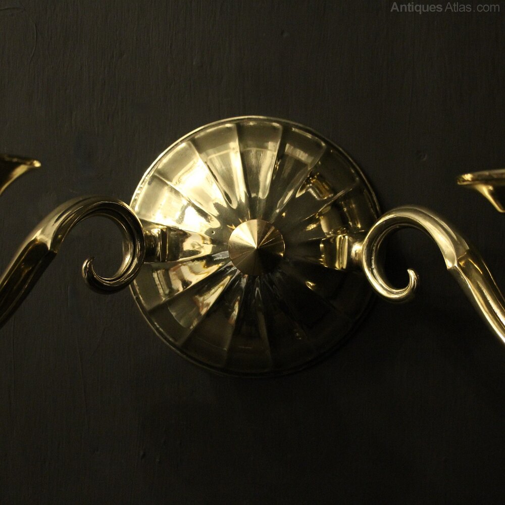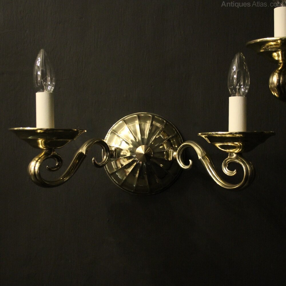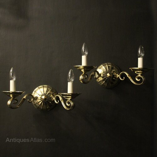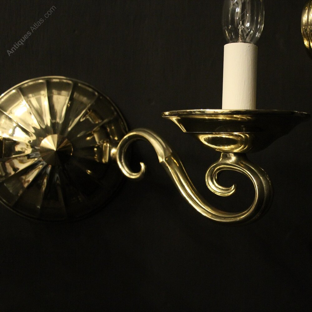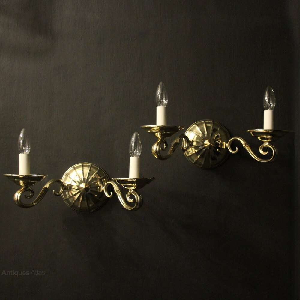 An English pair of repolished brass twin arm antique wall lights, the scrolling arms with circular bobeche drip pans, issuing from a decorative scalloped circular backplate, sympathetically repolished and lacquered. Fully rewired and PAT tested. All our wall lights come with aged brass screws for fixing and spare bulbs.