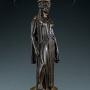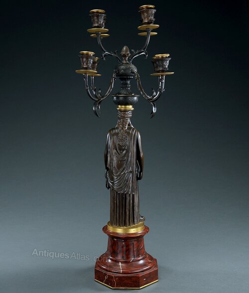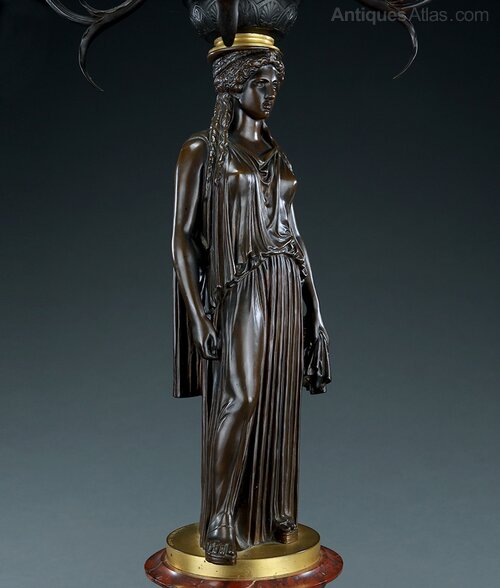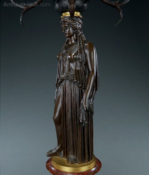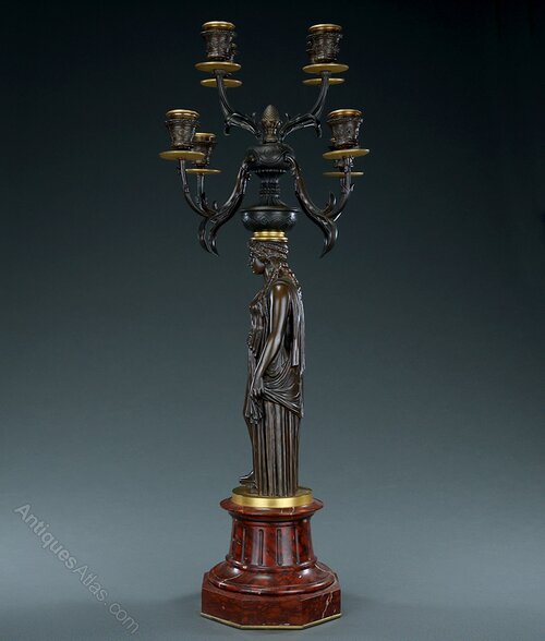 Impressive, large scale, elegant single French 19th century eight branch classically inspired patinated and gilt bronze candelabra by Ferdinand Barbedienne (1810-1892). The central figure is based on the caryatids that adorned the front of the Erechtheion, also known as the Temple of Athena Polias, at the entrance to the Acropolis in Athens. Rich brown patinated figure with eight complete candle cups with gilt bronze bobeches and dip trays. Presented on a superb, very attractive Rouge Giotte marble fluted pedestal column with a hexagonal slab base. Signed 'F.Barbedienne' with a 'Reduction Merchanique seal of Achille Collas'. Very fine example. France, circa 1870.