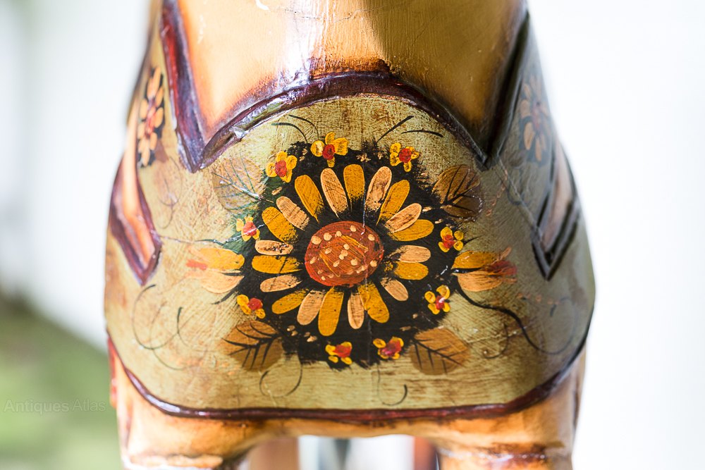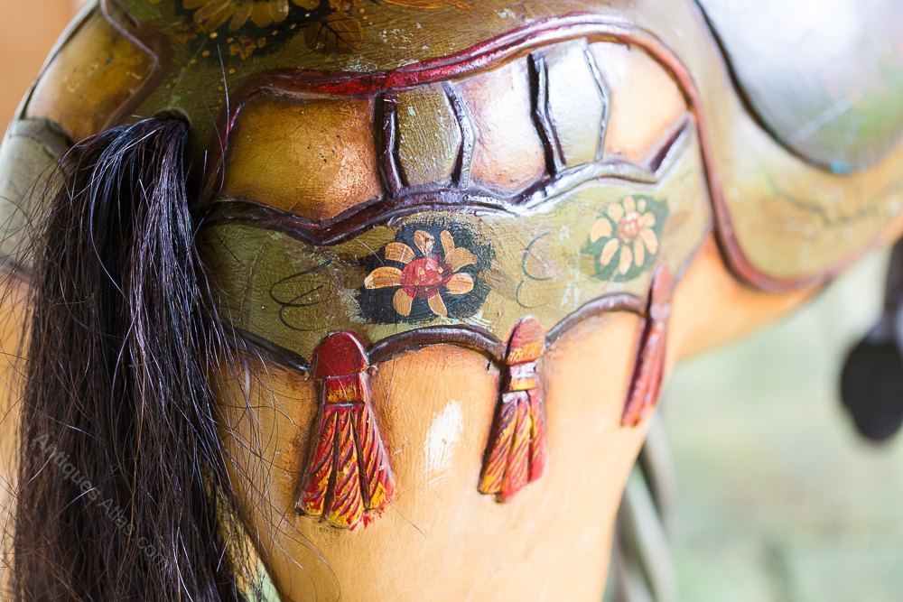 A European antique polychrome painted carved wooden galloping carousel horse, mounted on a twisted metal rod on stand. Lovely faded polychrome finish, solid, and with real horse hair tail.