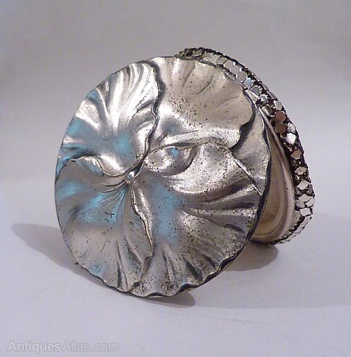A delightful silver tone Evans 'Orchid' mesh bottom compact as seen in many compact books including Laura M Mueller's 'Collector's Encyclopedia of Compacts, Carryalls & Face Power Boxes. The lid is an orchid in high embossed relief & given an 'antiqued finish' which looks gorgeous! The lid lifts to reveal the underside of the orchid - this given the 'antiqued finish' too & a framed mirror which gives an excellent reflection. The mirror frame also given this antique look. The powder well is protected by plastic to prevent powder from damaging the mesh bottom. The original gauze is in place. The mesh bottom is excellent too like the whole compact - very sound.