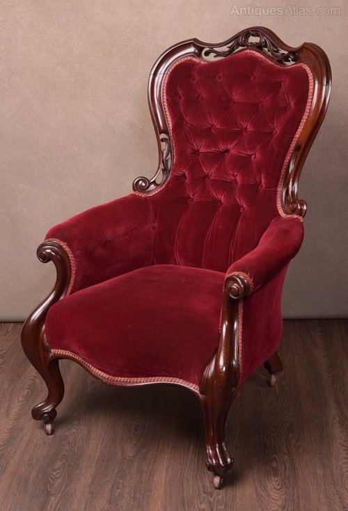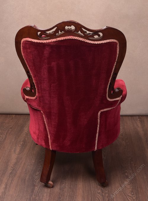 Victorian button back Arm chair made with solid mahogany show wood with crisp carved scrolls and pierced top rail, raised on cabriole legs with brown china castors fully upholstered in red velvet material in fantastic condition