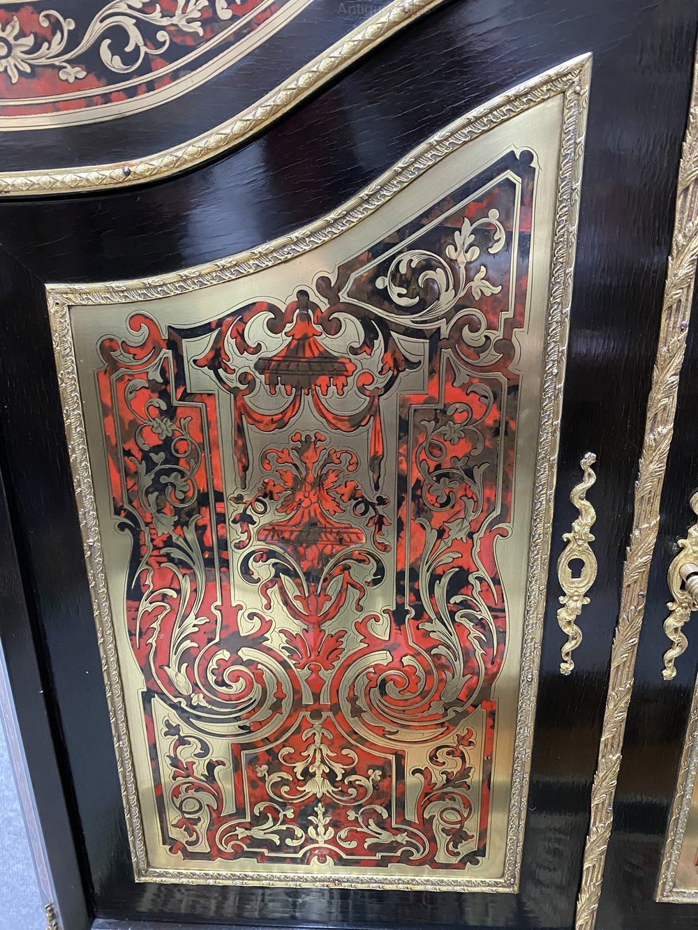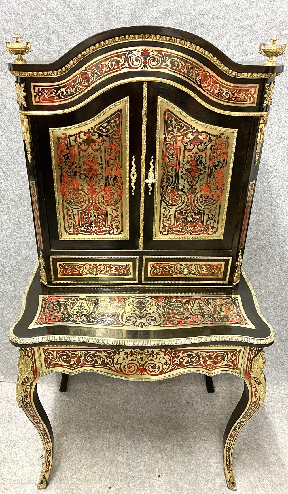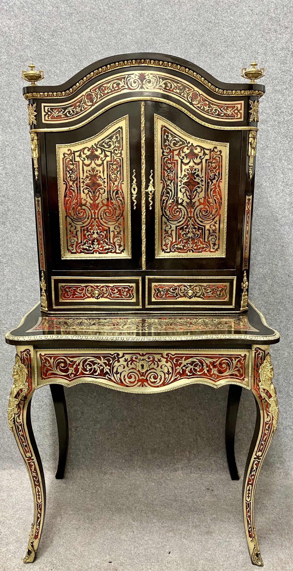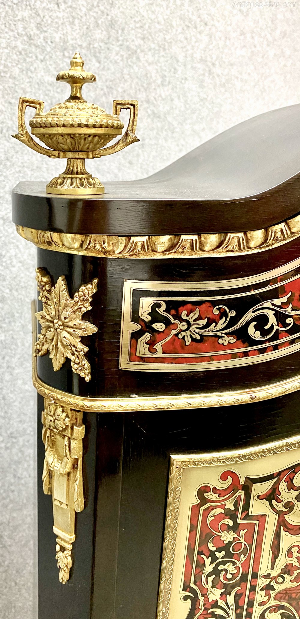 A fine quality and beautiful 19th Century Boulle bonheur du jour writing table. The serpentine shaped top having an ornate brass moulding flanked by brass urn shaped finials. The canted corners supporting the two arched doors which open to reveal a polished mahogany and shelved interior with 2 useful drawers below. The base section of serpentine form with a full width drawer which opens to reveal a sliding writing surface. This bonheur du jour is raised on elegant cabriole legs with ormolu mounts to the knees and terminating in ormolu sabots. The whole in excellent pristine condition, fully cleaned and waxed in our own workshops to a very high standard and benefitting from working locks & keys. Dimensions :- Max.Height…63.75’’/ 162cm. Width…32.75’’/ 83.5cm. Depth…21’’/ 53.5cm. Base Height…31.5’’/ 80cm. Top Height…32.25’’/ 82cm. Delivery to most of U.K. mainland £65.