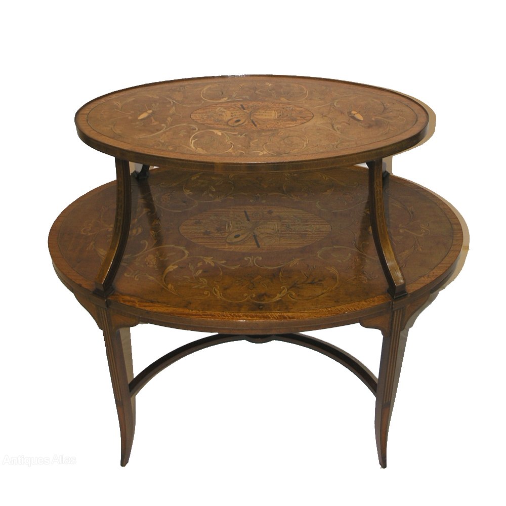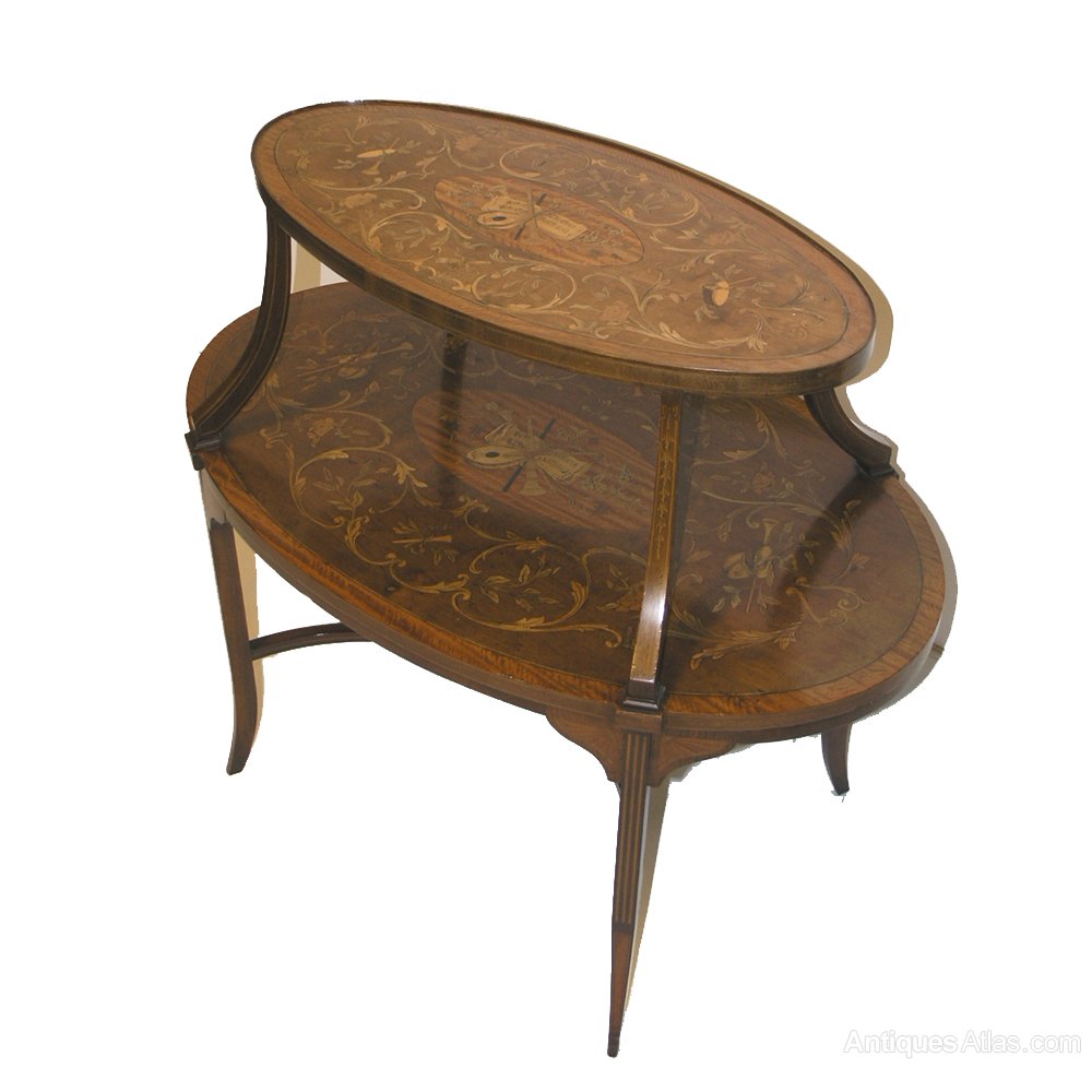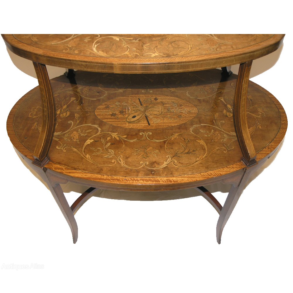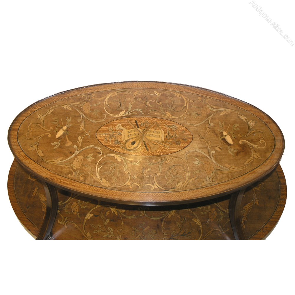 Fine quality two tier oval Edwardian satinwood and marquetry etagere with a music influence. This was obviously made by one of the top Edwardian cabinet makers such as Edwards and Roberts and was probably a commission piece for a music room.