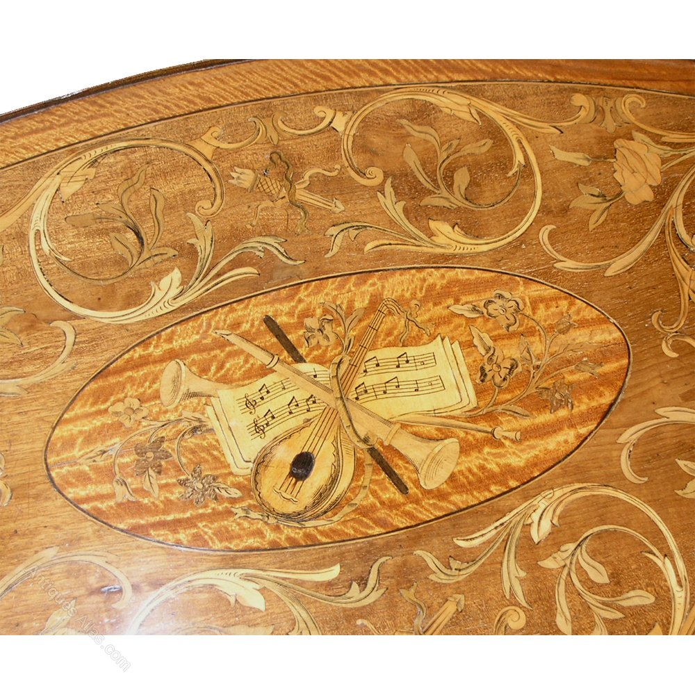 The marquetry is of very good quality and is of a superb design. The top oval is smaller than the bottom oval.