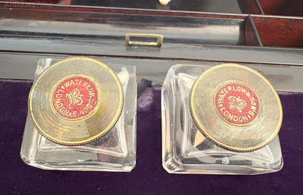 Here we have a wonderful quality ladies writing slope made with fabulous Mother Of Pearl and Abalone inlaid into Ebony which has then been veneered on to Mahogany, upon opening the working lock and key the interior is furnished with a plush purple velvet slope below a fitted top section housing pen tray, lidded sections for stamps, and two original glass inkwells with named lids for Waterlow & Sons, London. who were a prominent stationer's company famous for producing stamps and bank notes, there is also a storage section underneath the slope.