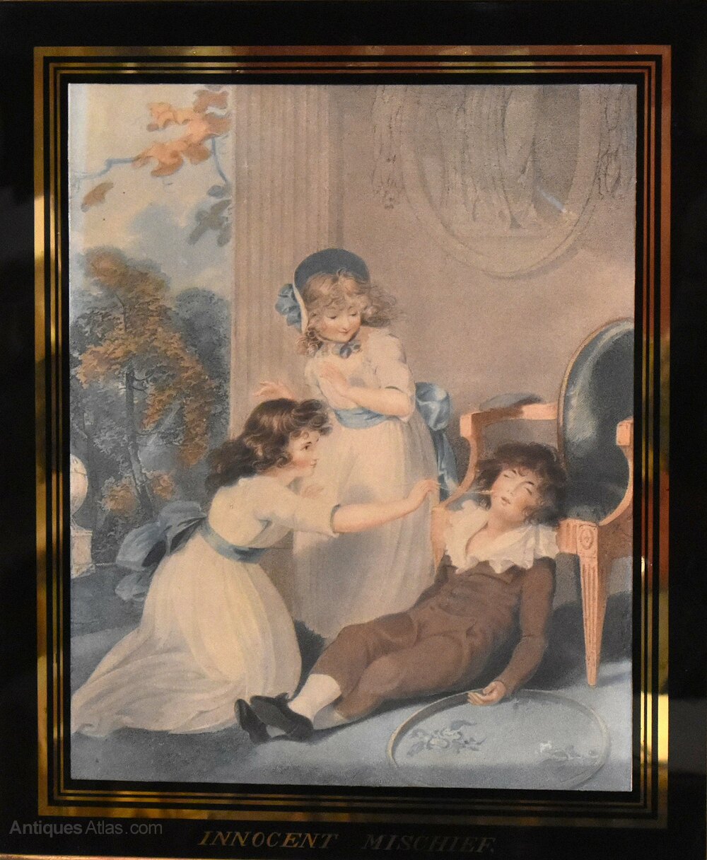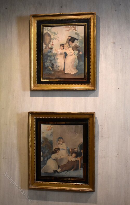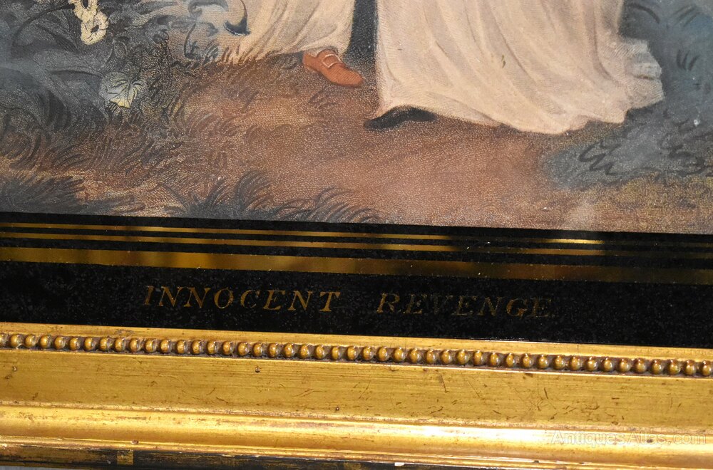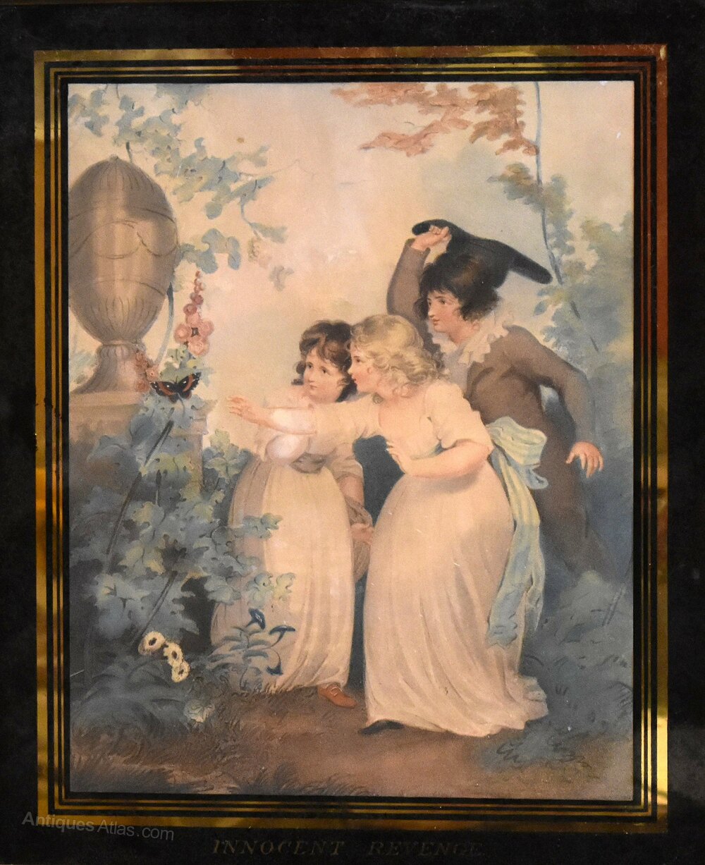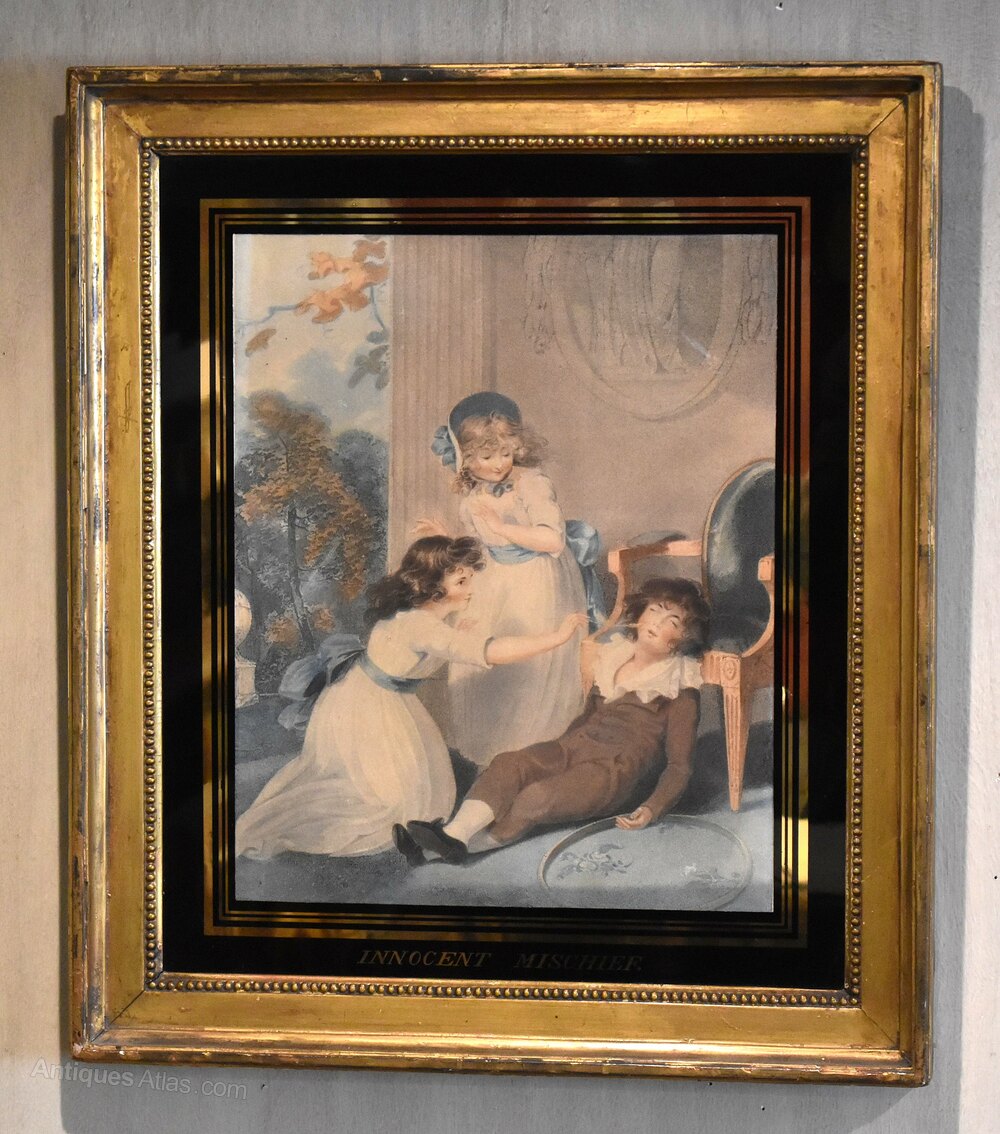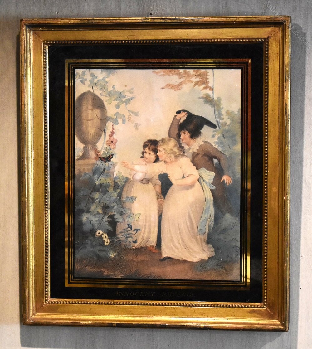 A fine pair of hand coloured stipple engravings after Richard Westall 1766-1836. The pair are titled Innocent Mischief and Innocent Revenge and picture children playing. The pair are in very good antique condition with particularly bright colours. The prints retain the original gilt frames, and verre eglomise painted glass which also has the titles beautifully inscribed on it. The pair have had the prints refitted to the frames recently. The prints are wonderfully decorative period pieces and are ready to hang. C.1820