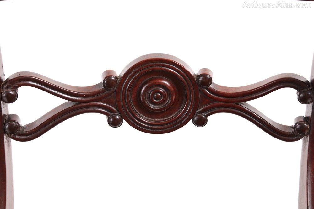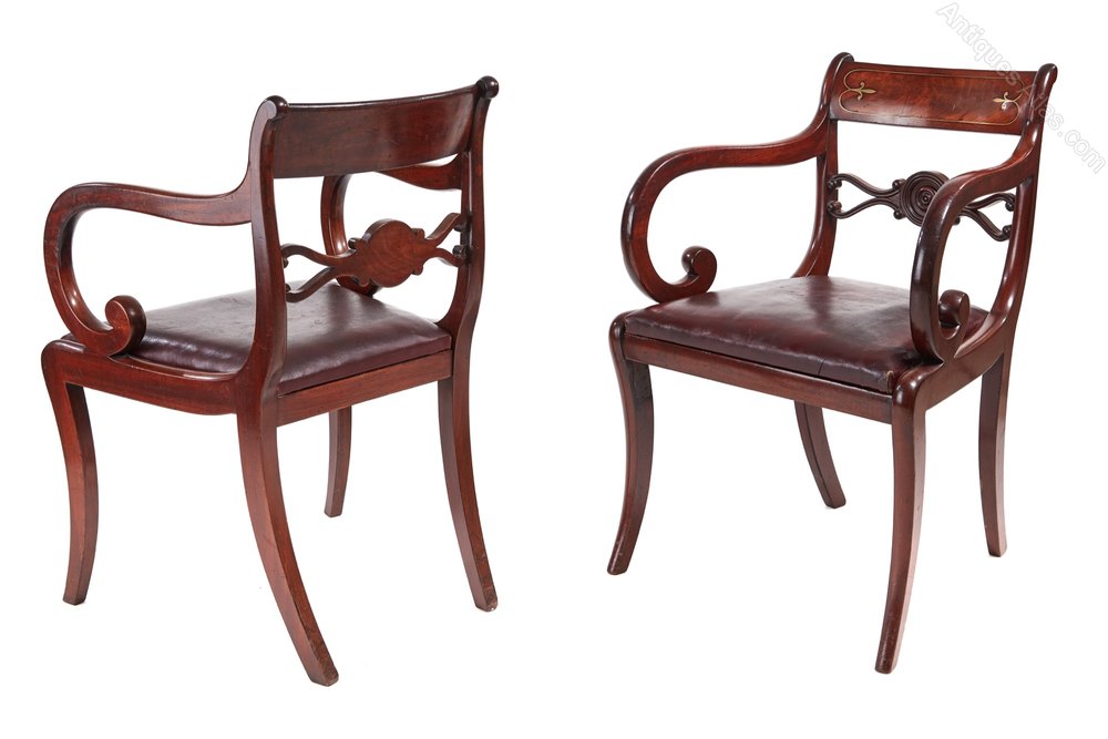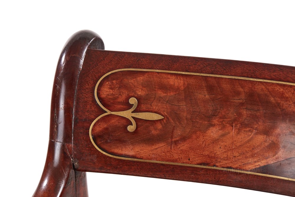 Fine pair of Regency mahogany brass inlaid elbow chairs,with a shaped brass inlaid top rail,shaped and carved centre splat,scroll shaped arms,drop in seat,standing on sabre legs