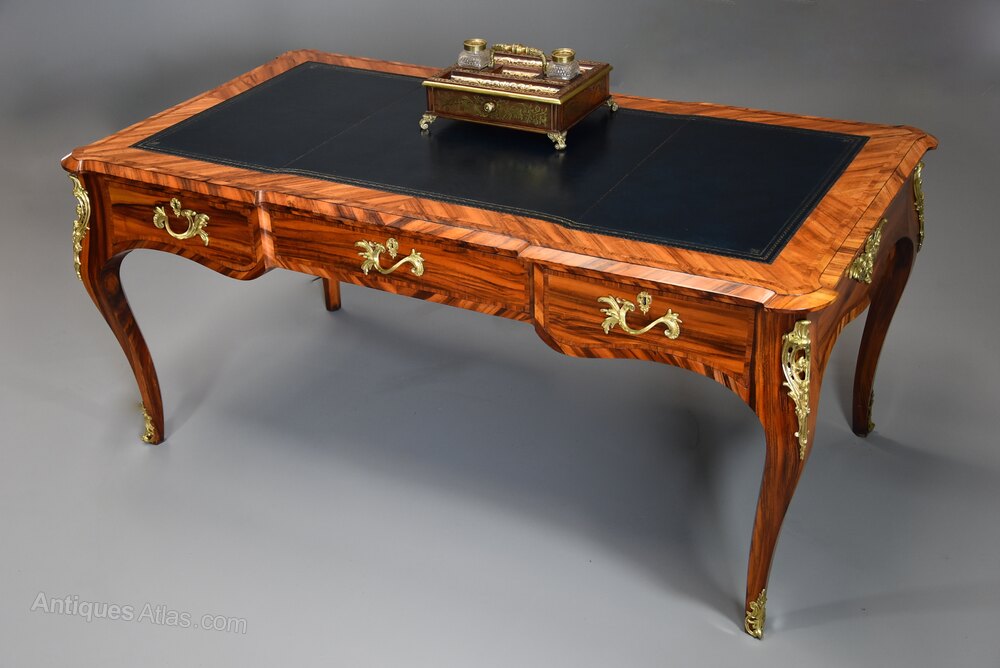 The bureau plat is supported on four solid gonalo alves cabriole legs, each with original gilt metal Rococo style mounts to the top with a smaller one to the foot.