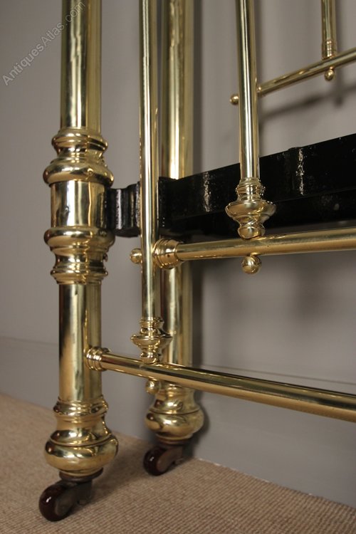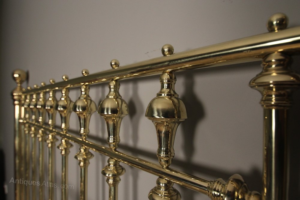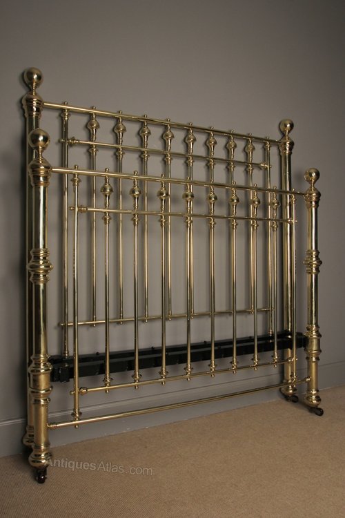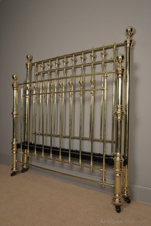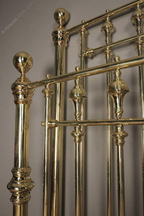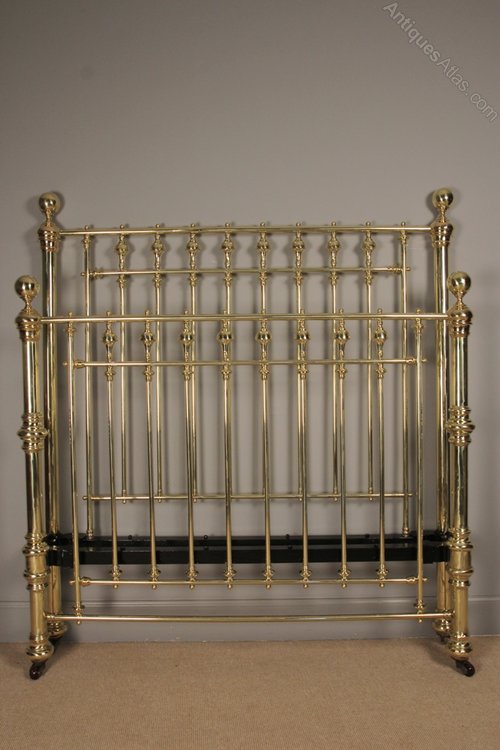 A fine high quality all brass double bed, having decorative vase decoration to both the head and foot end, with ring turned cuff decoration to the uprights terminating in brass ball knobs. The whole raised on porcelain castors. This bed comes complete with the 2 original side irons and a wooden slatted base. This bed will take a standard double mattress (4tf6).