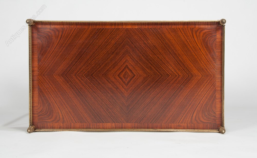 The rectangular top quarter veneered in Kingwood with a crossbanded tulipwood border enclosed with a pierced brass gallery, held by four turned supports surmounted by pineapple finials with the lower conforming tier having a ribbed mould edge.