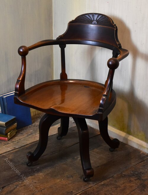 A fine quality and unusual design, late Victorian period rotating office chair. The chair is very substantially made in solid walnut which has the most wonderful untouched patina with a great polish to the seat and arms through years of use. The design features a carved fan to the chair back and large balls on the arms, giving it an almost neoclassical feel. The condition throughout is excellent with the odd minor fault and the original castors. A great and perfectly useable armchair in excellent condition. C.1890.