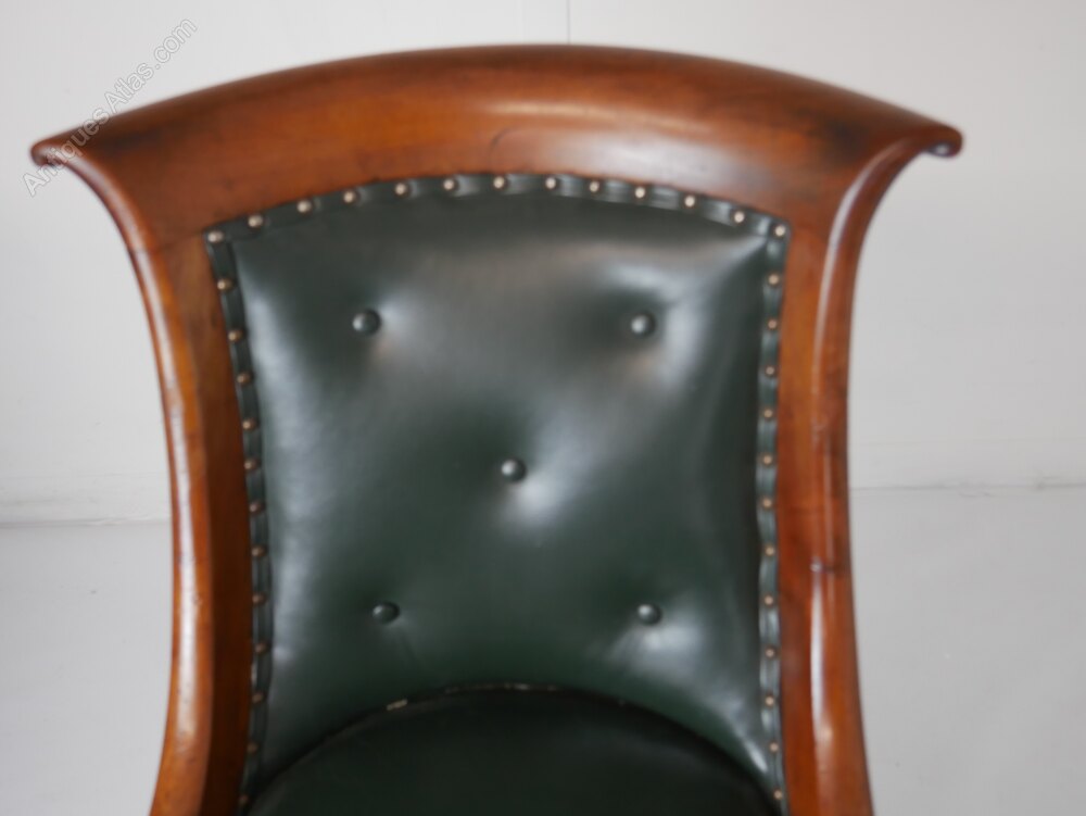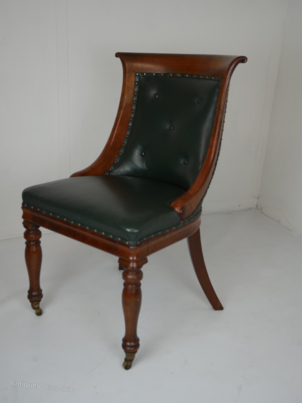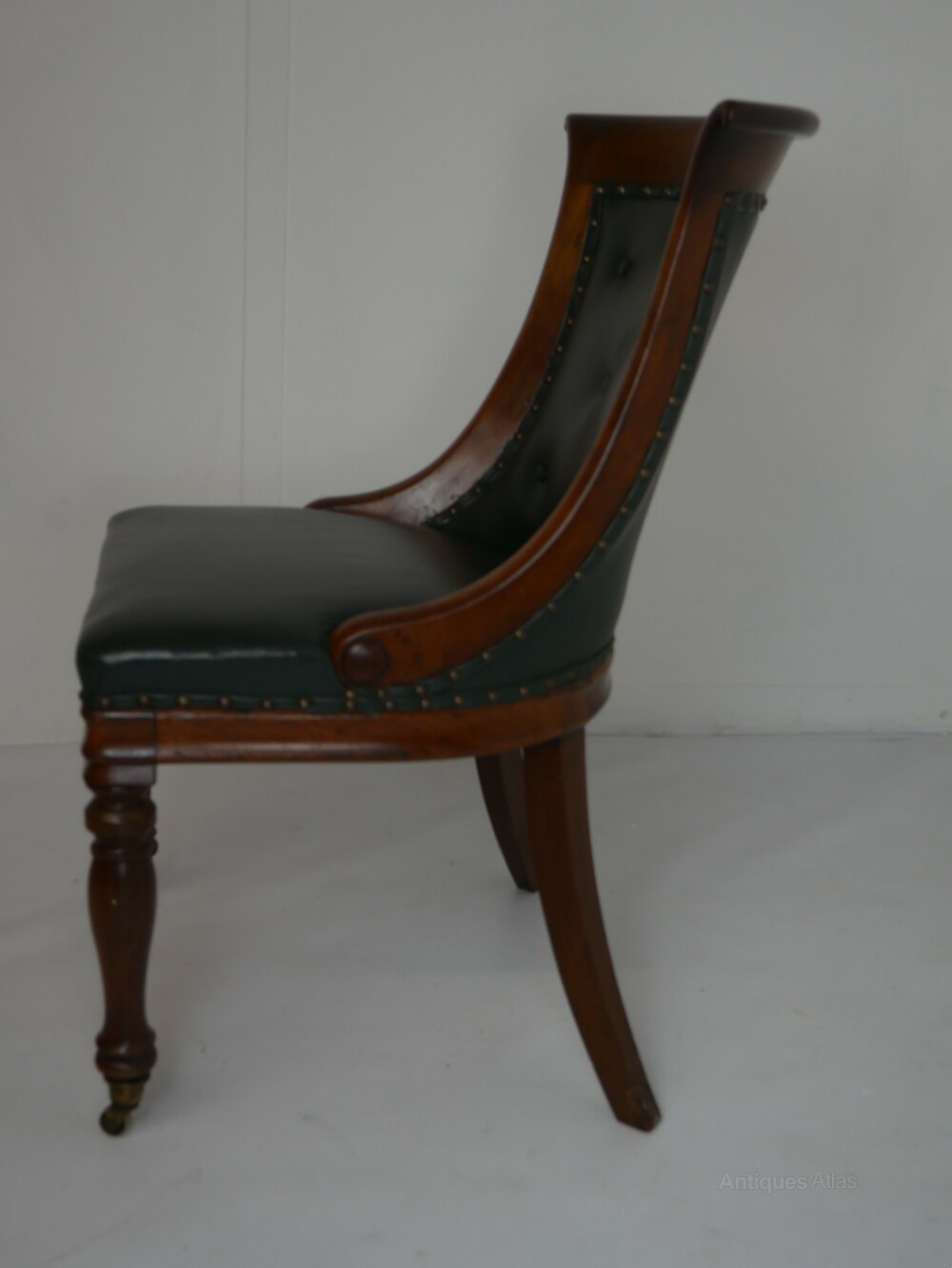 A exceptional and rare set of eight English William IV library chairs in mahogany with green leather upholstery. The chairs have lovely elegant backs, with a turned front leg and original brass castors, a lovely kick to the back legs.