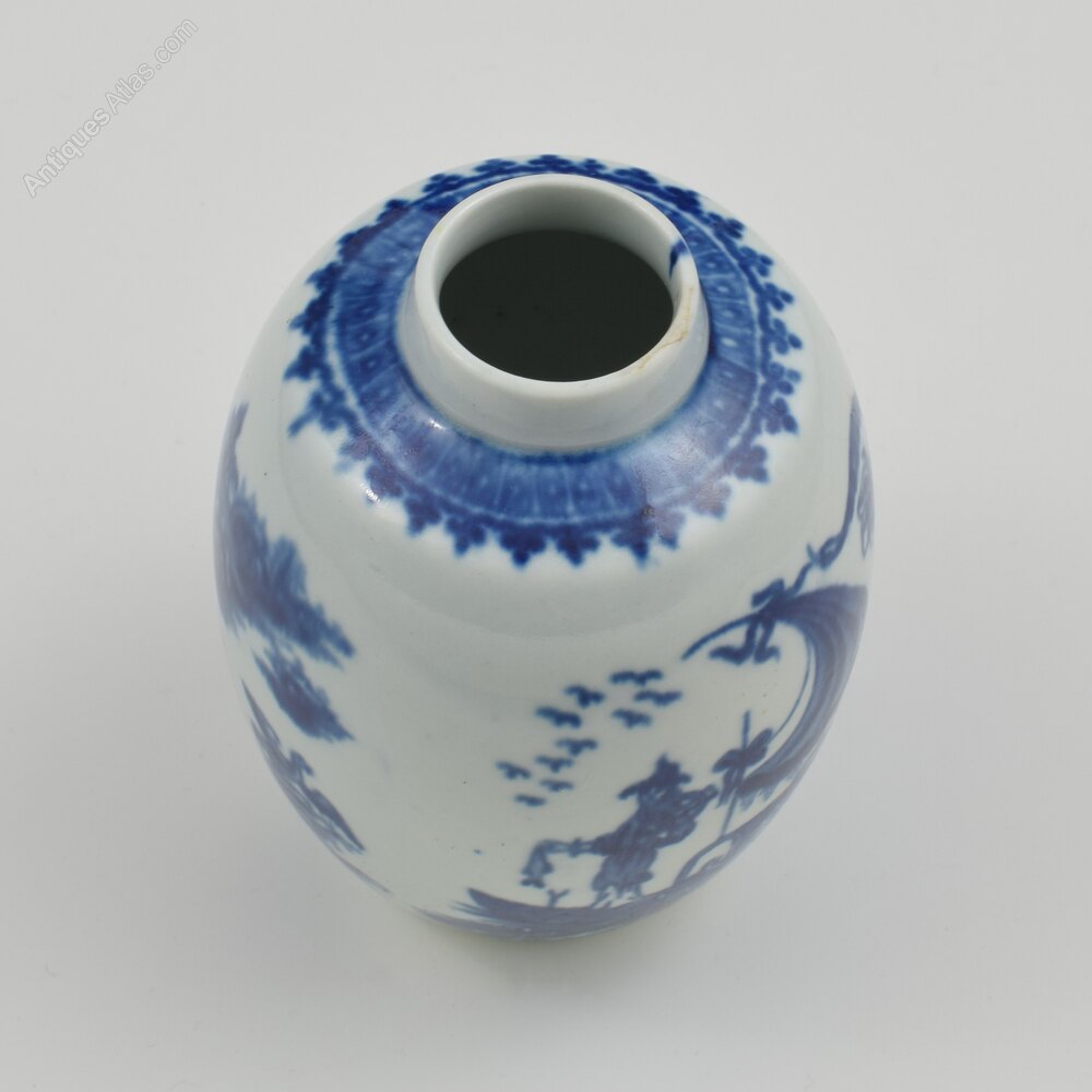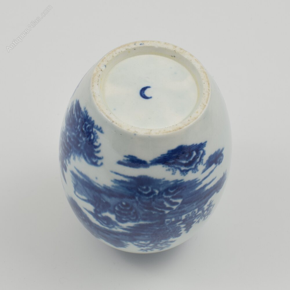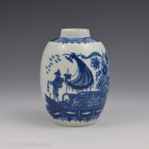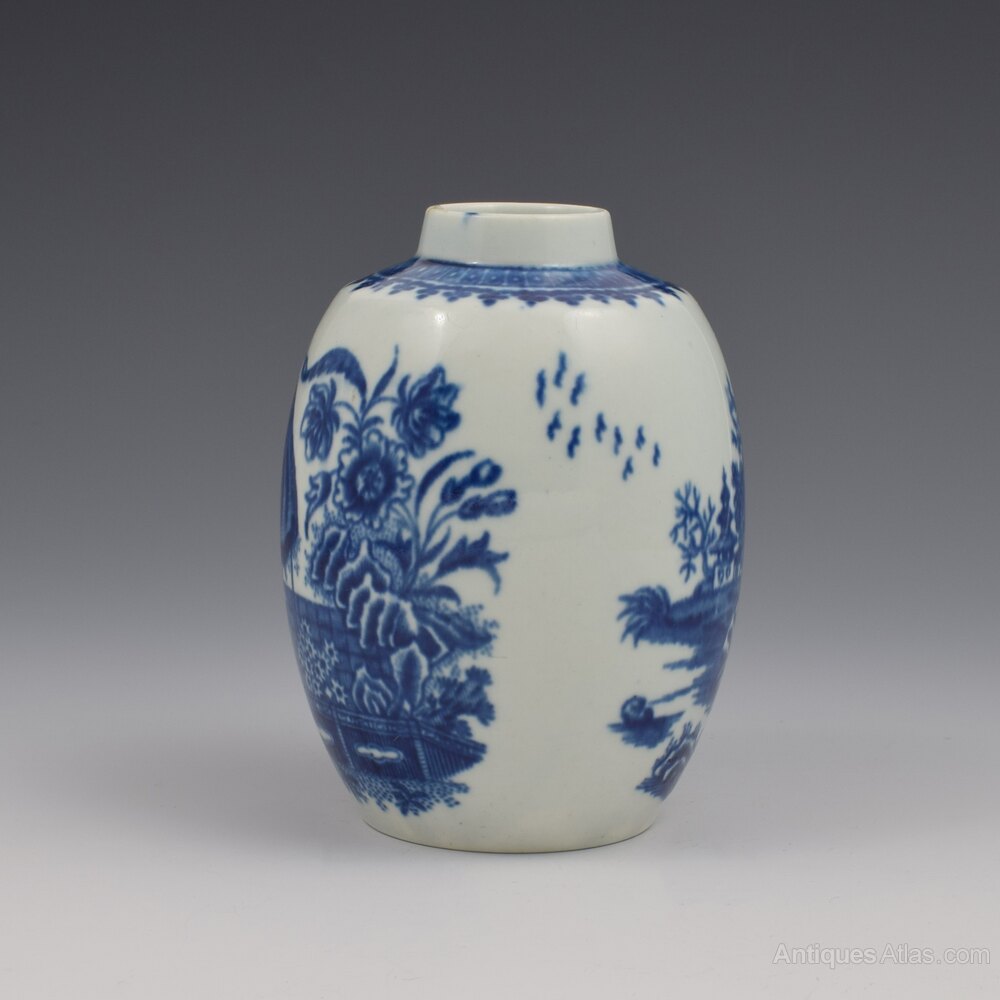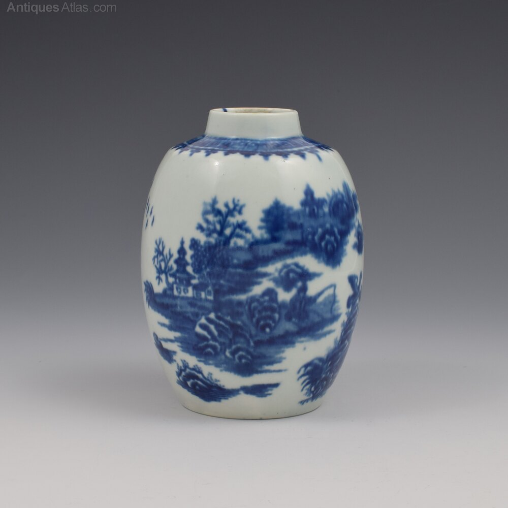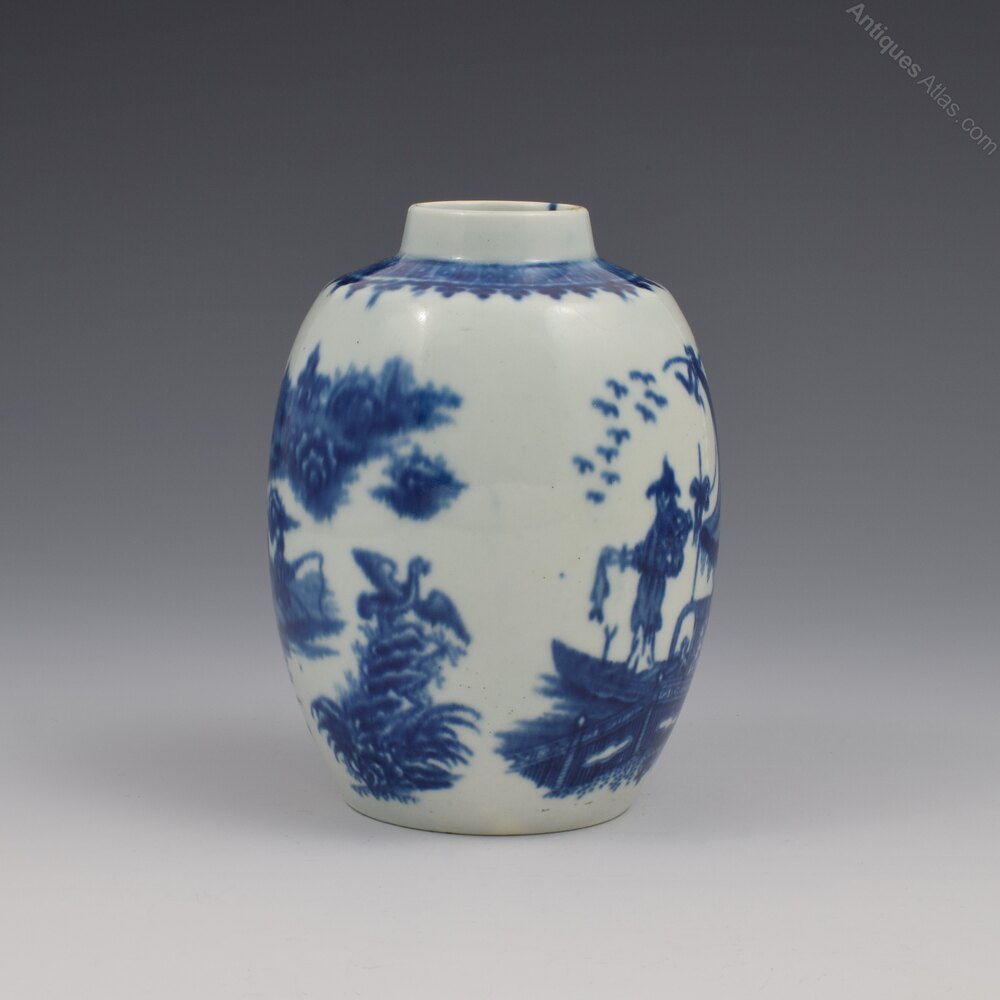 A rare Worcester porcelain tea canister of barrel form with canted shoulders and short, wide neck. Printed in the ever popular fisherman pattern, c.1775. Crescent mark to base.