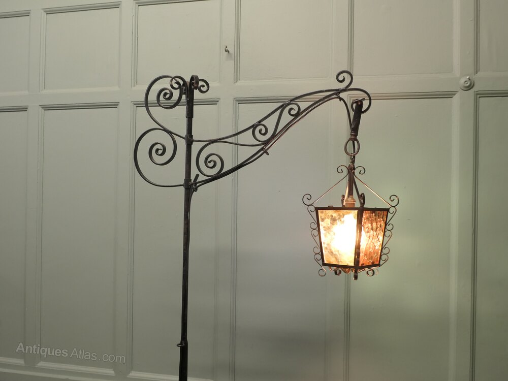 The lamp is made in wrought iron, it has a coloured glass lantern suspended from the adjustable arm, this unusual lamp is in good and working condition