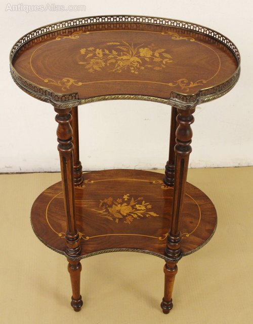 A pretty kidney shaped floral marquetry 2 tier etagere , or stand. Of very good construction in solid walnut and attractive figured walnut veneers. Each tier is decorated with floral marquetry inlay and the top tier is surrounded by a crisp brass gallery. Standing on turned and fluted columns and legs. A lovely little etagere in excellent original condition. With a great colour and patina, ready to go straight into the home.