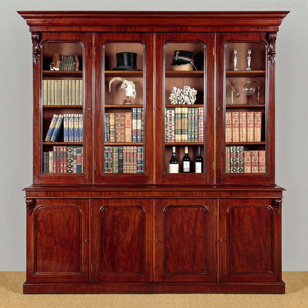 Large four door mahogany library bookcase c.1870. Glazed bookcase top fitted with three adjustable shelves to each section (internal depth 10¾"). Over a deeper base with blind panel doors and a single shelf inside (depth 17"). Simple uncluttered design with a deep ogee moulded cornice and carved corbels top and bottom, rounded upper corners to the door panels, set within moulded surrounds. Raised on a crossbanded plinth. Solid mahogany sides and groundwork to the doors. Excellent colour and condition, cleaned and waxed in our workshops. Keys supplied.