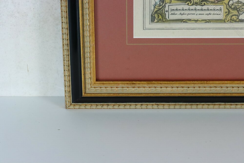 This map is from our own collection. We have mounted it below burgundy coloured board and displayed it within an expensive gilt and black frame. Unfortunately, we forgot to photograph the reverse before framing it.