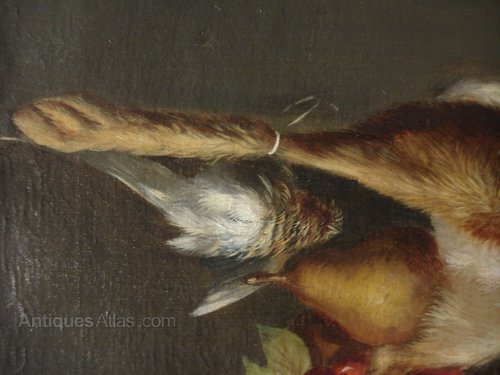 Ref 6319 - 19th Century oil on canvas still life of fruit and game. Circa 1880.
