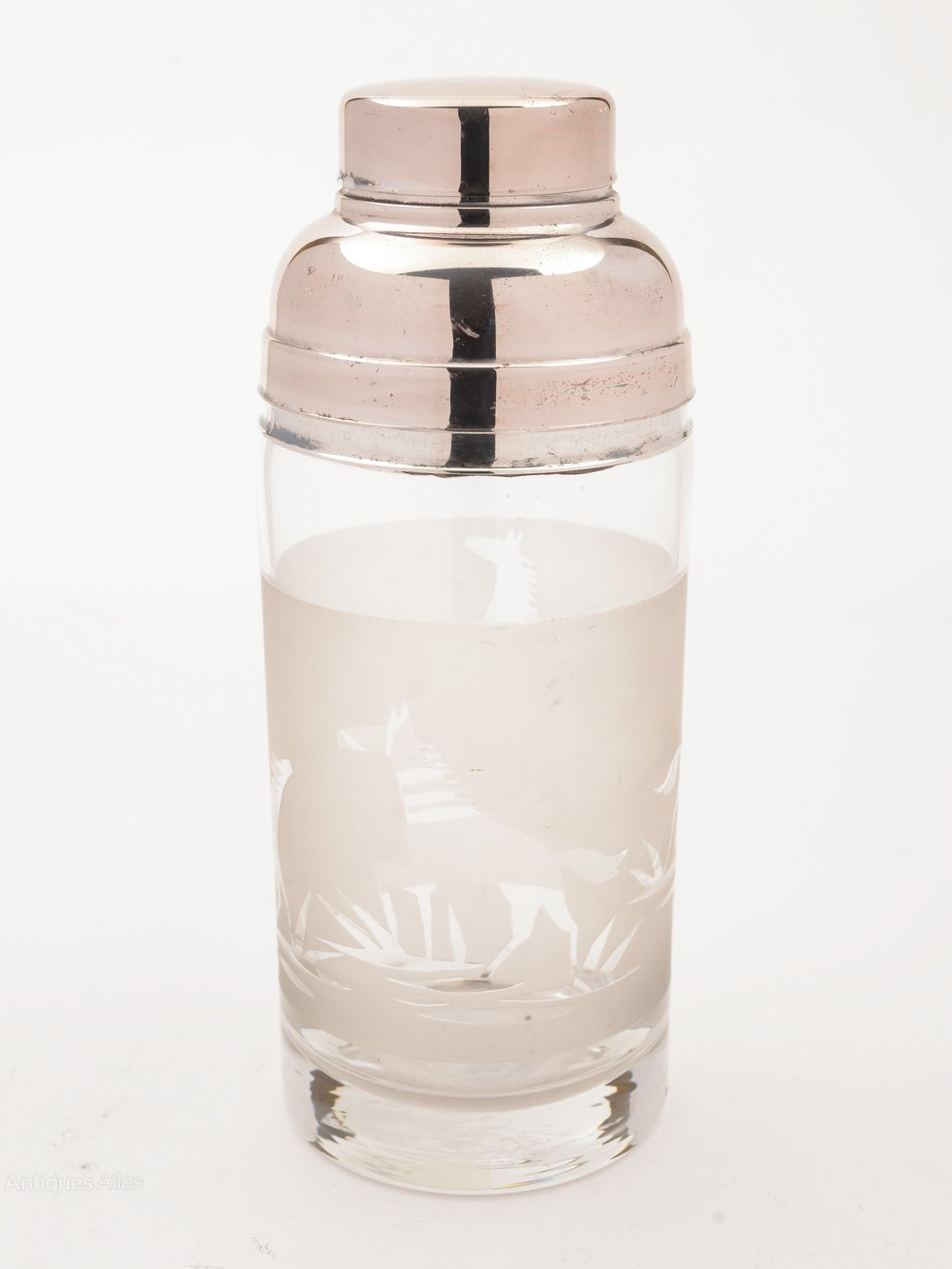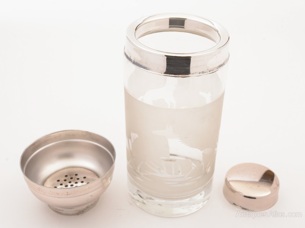 A fabulous French Art Deco glass and silver plated cocktail shaker with acid etched horse decoration to central band and silver plated pull-off lid. Circa 1930.