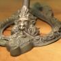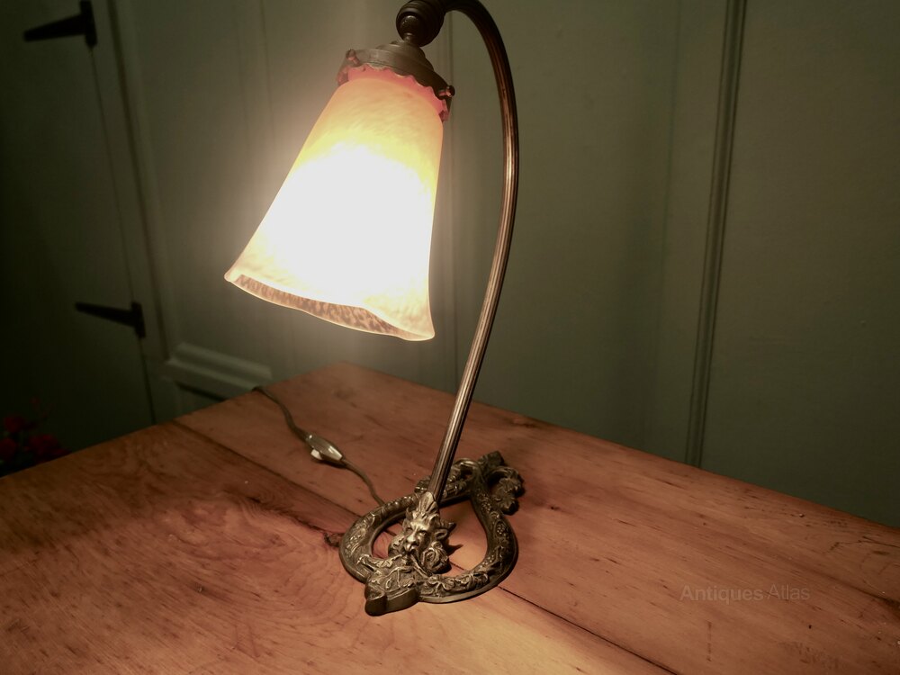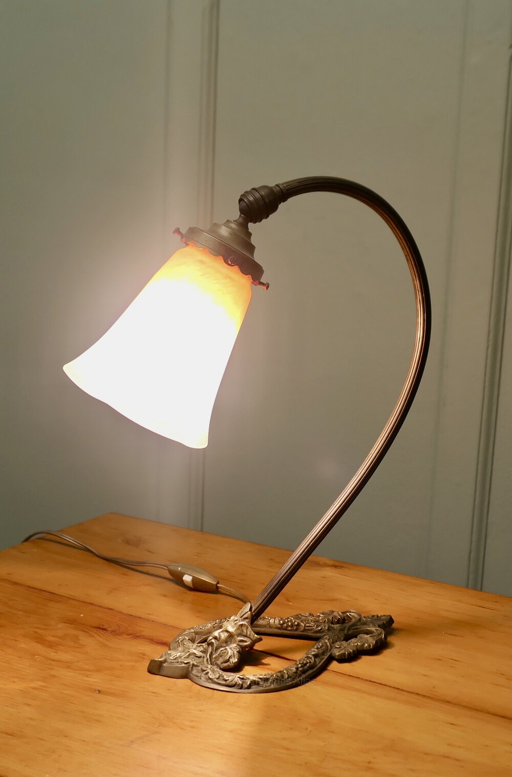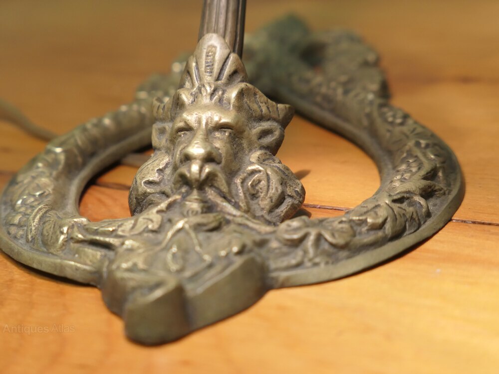 This is a very attractive piece, the lamp has a central column which is set on an unusual brass base with Celtic motifs and the face of the green man or perhaps it is Bacchus