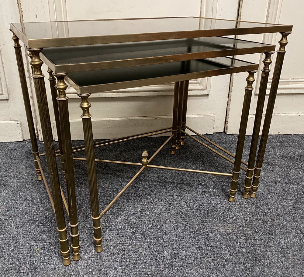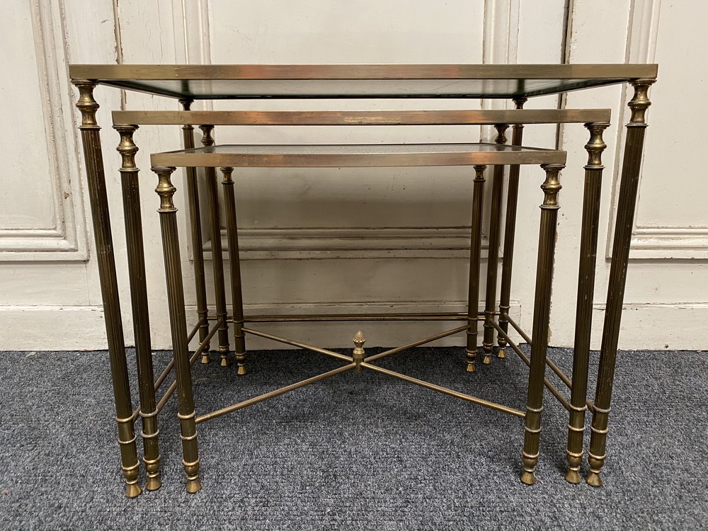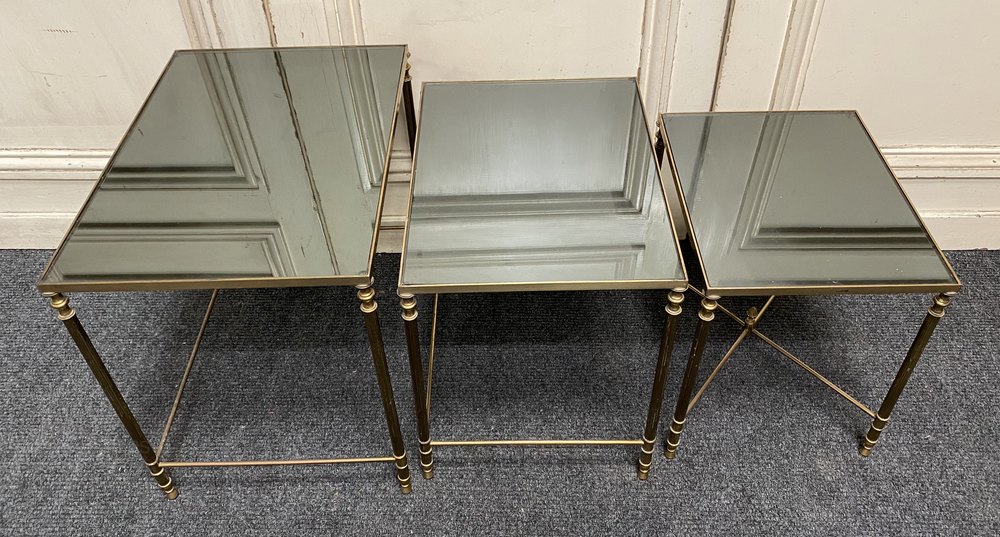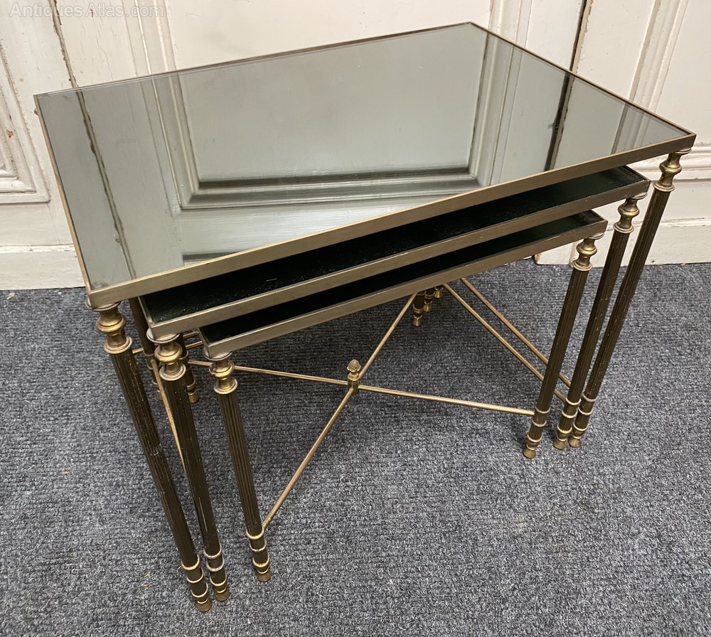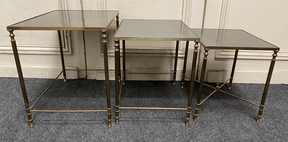 A lovely quality French Brass Nest of Table, having mirrored tops. Lovely reeded legs and the smallest has a cross stretcher. They are in really nice original condition. Please see photo for all dimmensions.