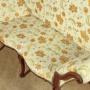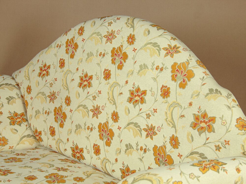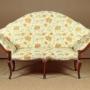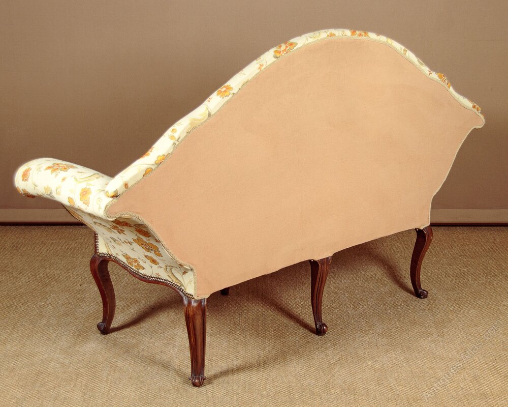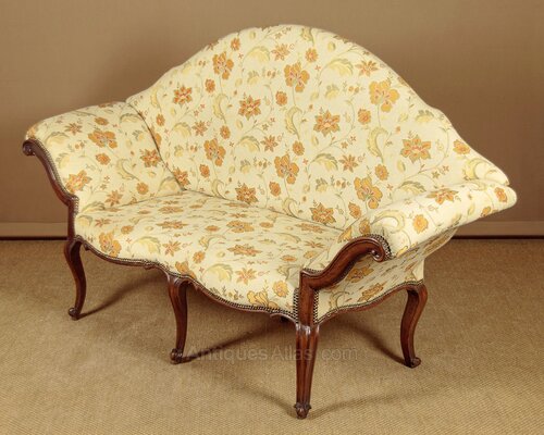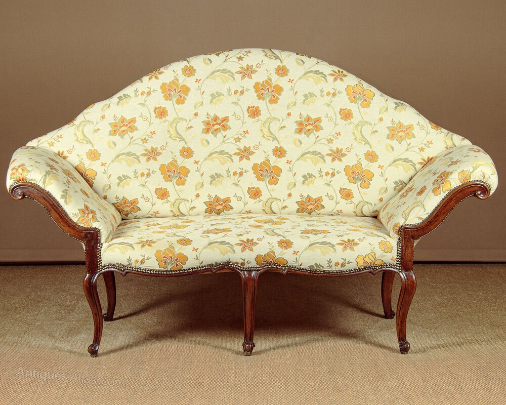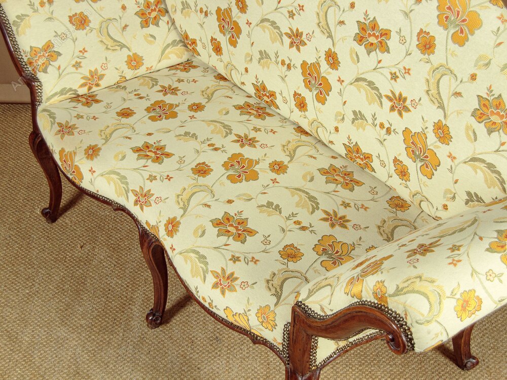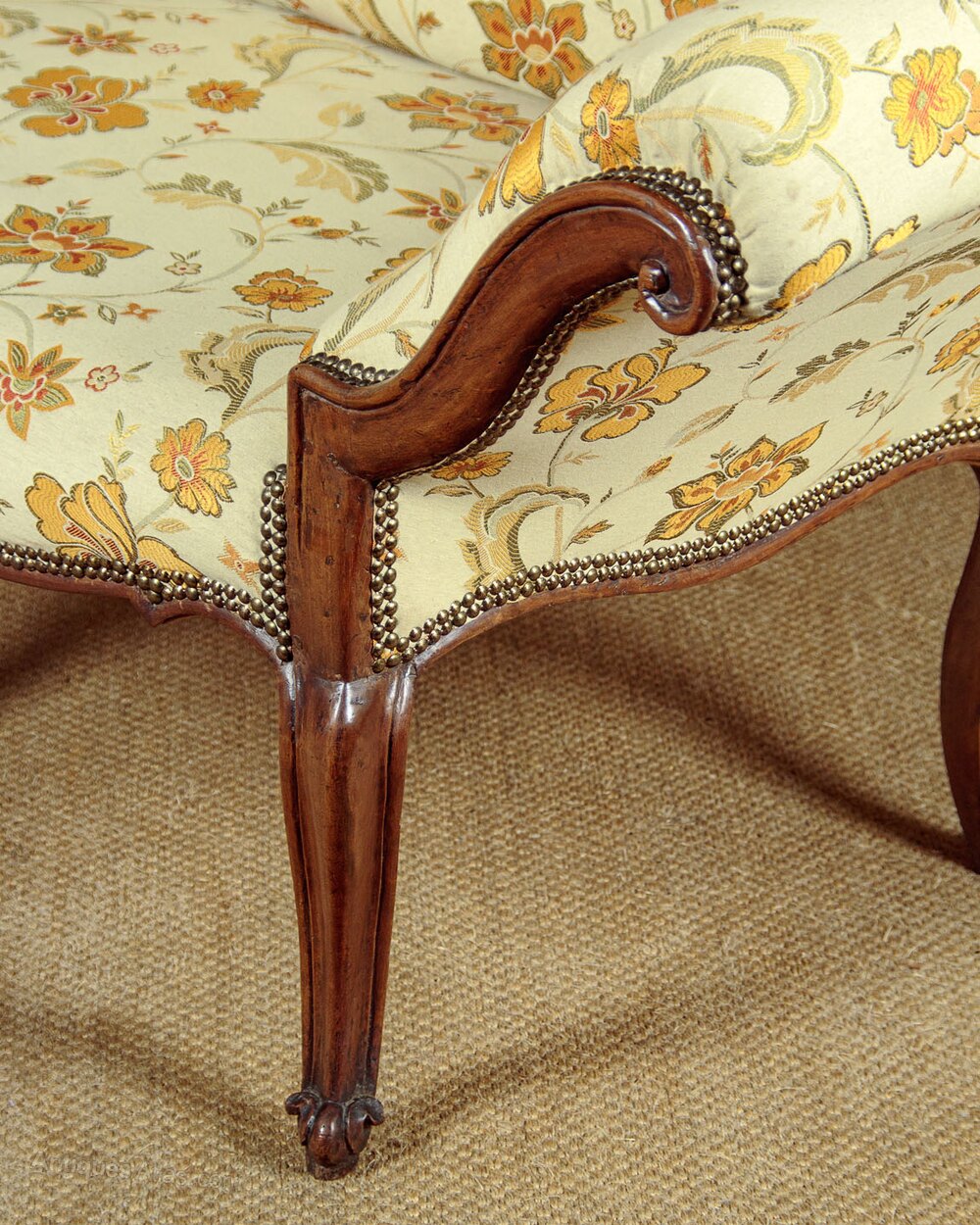 Rare French walnut canapé couch c.1760. High shaped and arched backrest and distinctive sloped overhanging ends over a webbed seat. Carved walnut frame with carved scrolling detail to the arm fronts, exposed shaped edge below the seat and cabriole legs front and rear with carved feet. Serviceable upholstery in a pale linen woven with an attractive floral pattern. Good condition, the frame has been cleaned and waxed in our workshops.