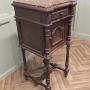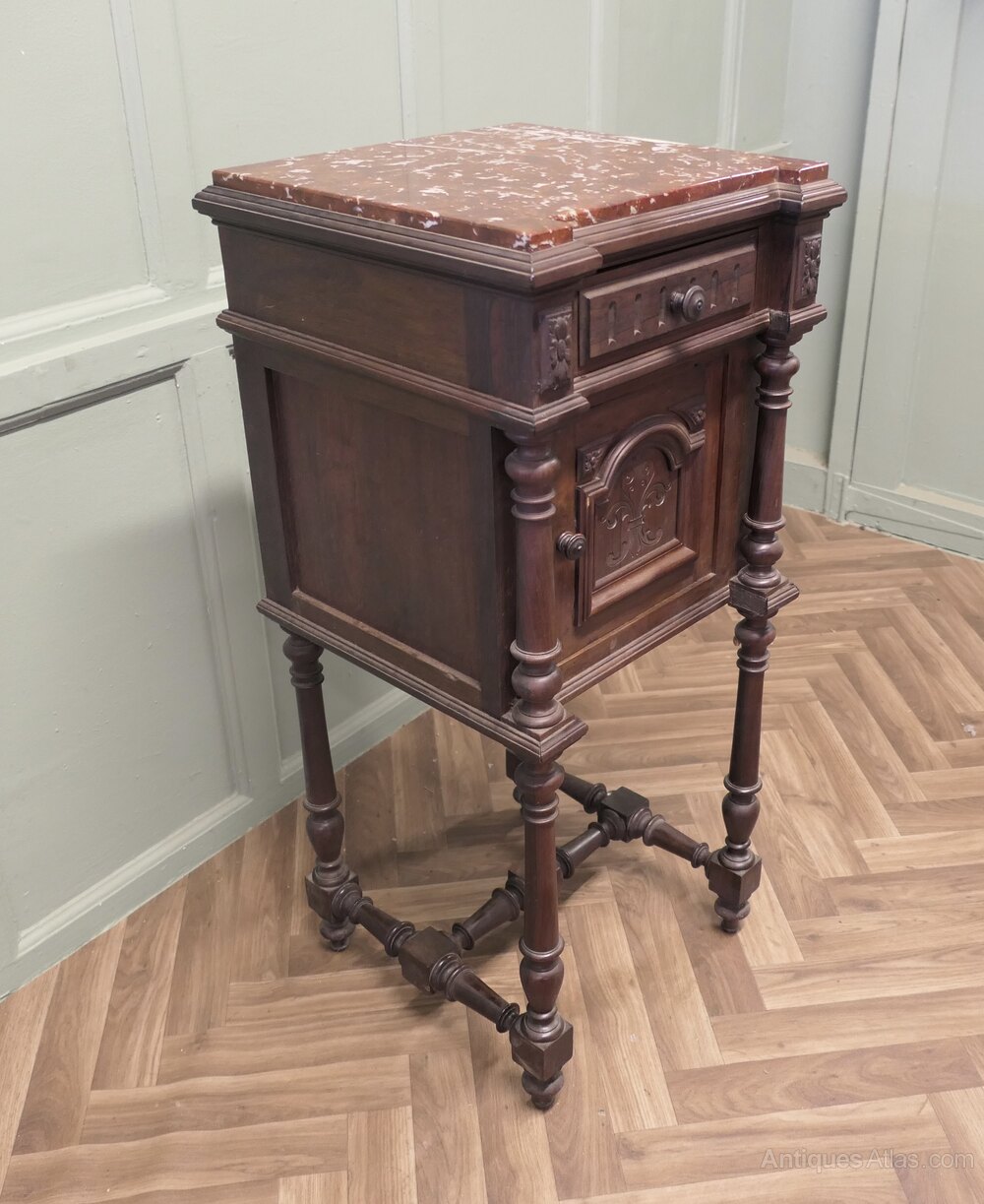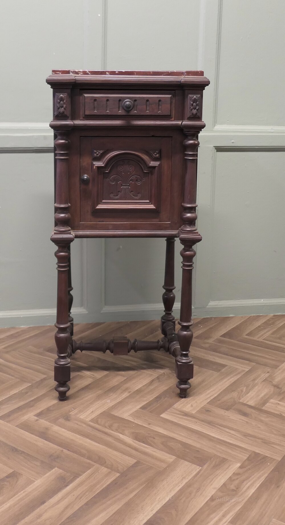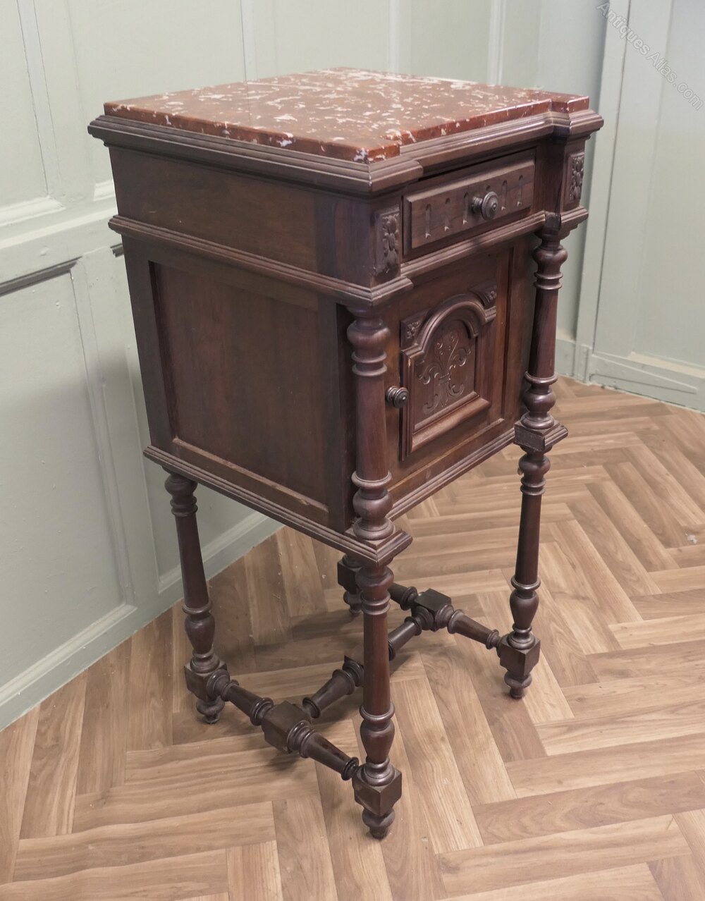 The cabinet has a thick dark pink marble top, the drawer and the cupboard door have turned wooden knobs and it is in all round good condition