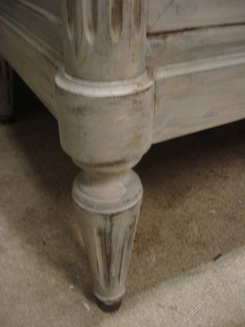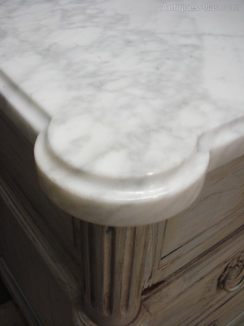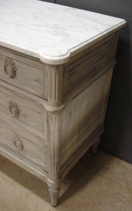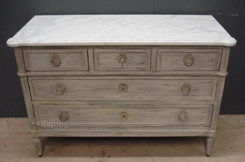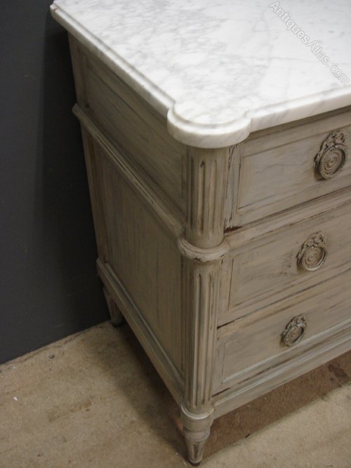 Ref 5564 - Worn pale grey painted Louis XVI style commode with 5 drawers. Original white/grey figured marble top. Top centre drawer with working lock. Circa 1950.